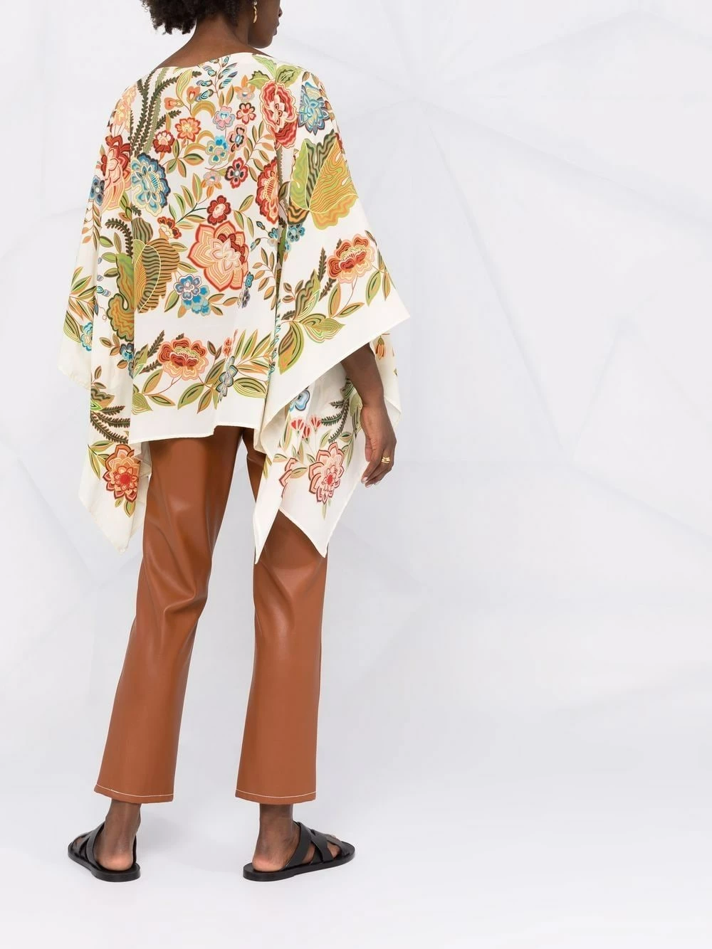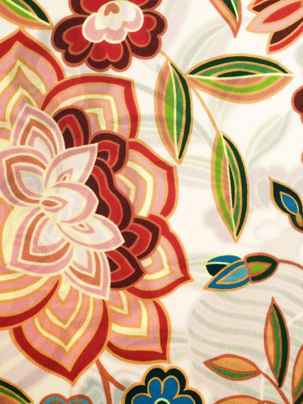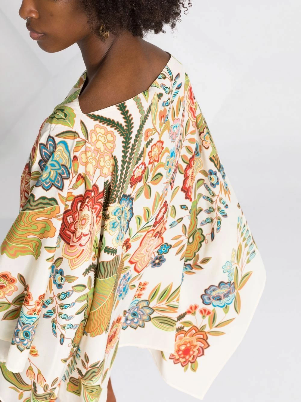 Fleurs brodées, design drapé, encolure ras du cou, manches longues. Matière : soie.