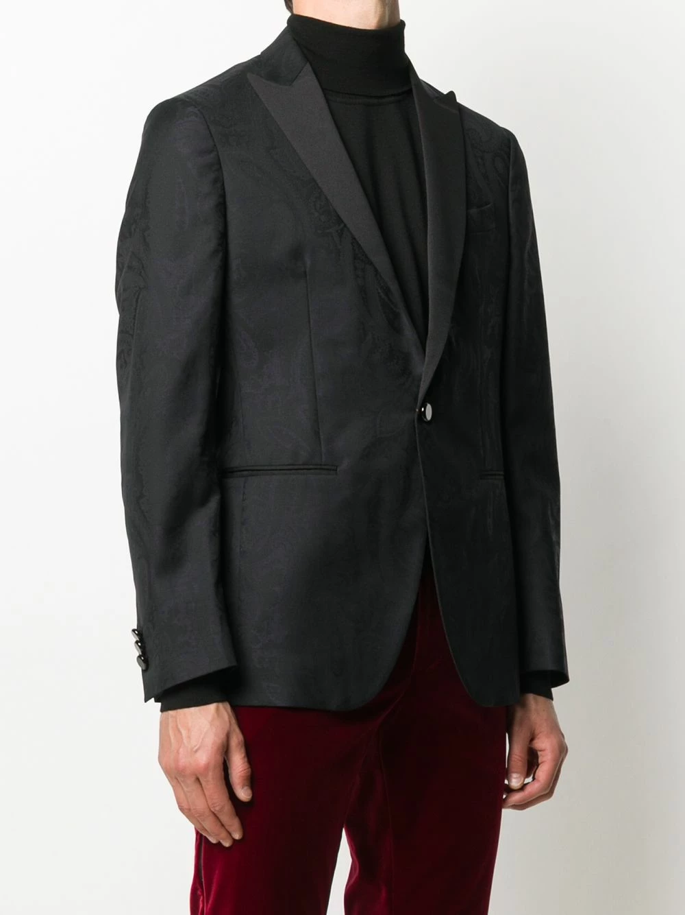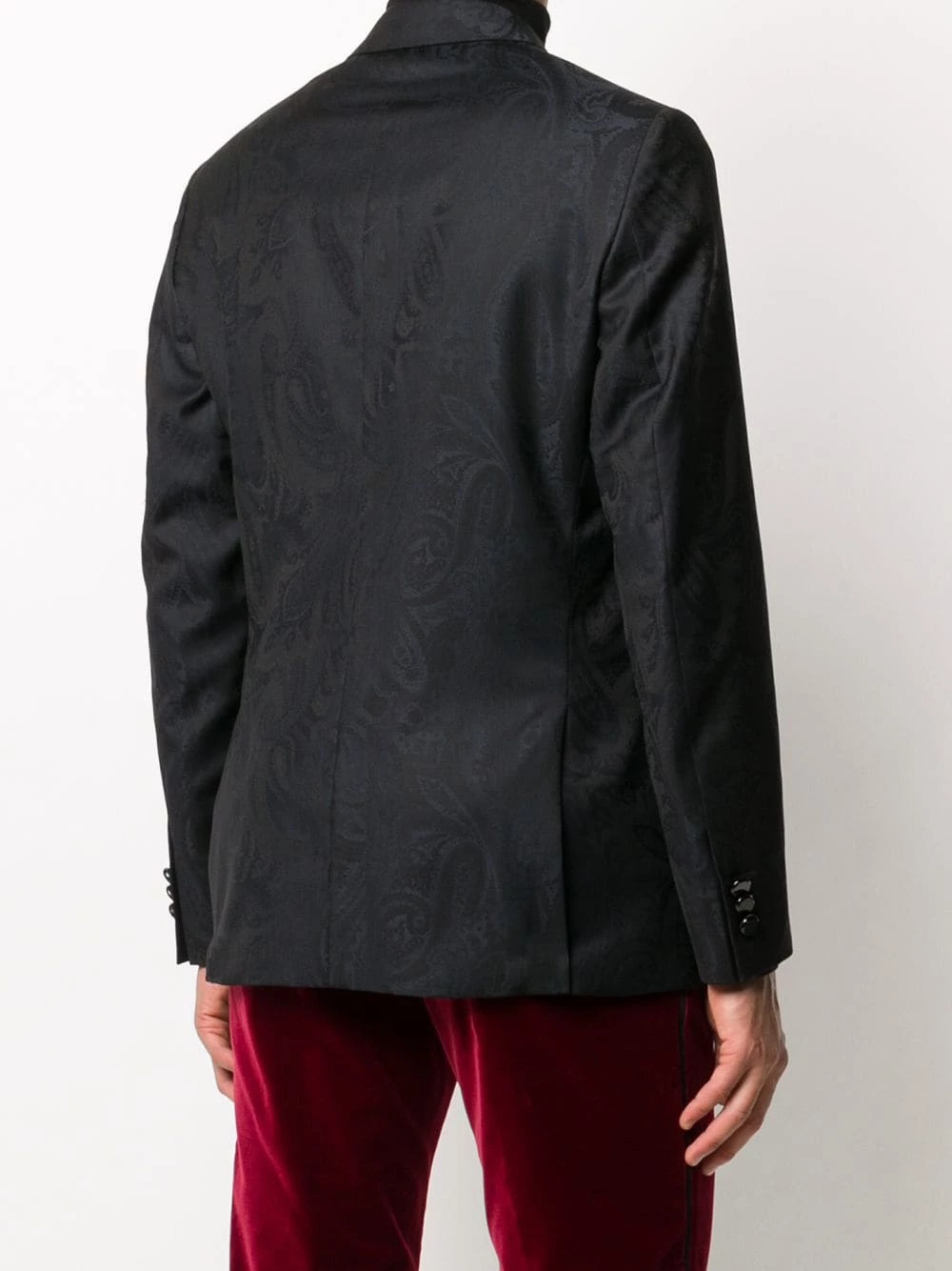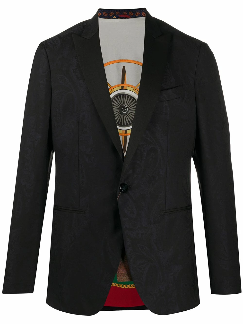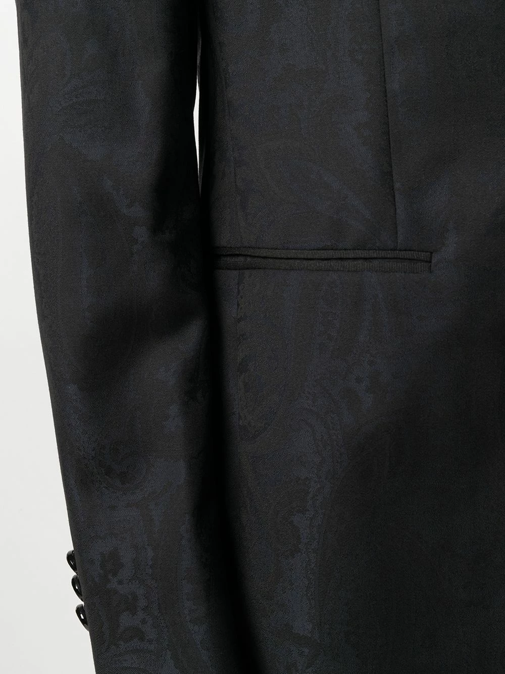 Blazer à motif cachemire Etro avec revers crantés, boutonnière sur le devant, manches longues, poignets boutonnés, pochette et poches devant. Couleur : noir.