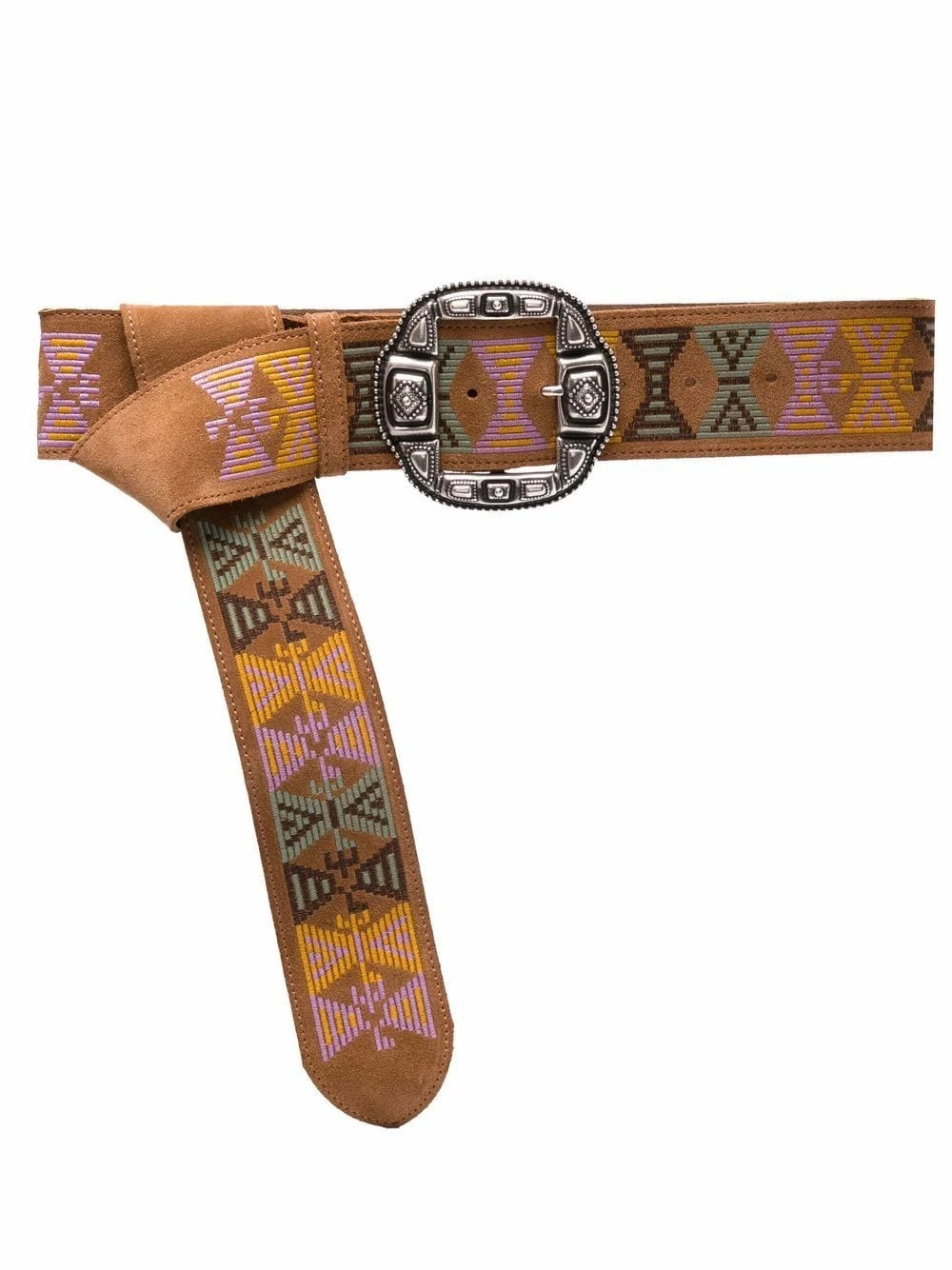 Broderies géométrique, finitions gravées, fermeture à boucle argentée, taille ajustable. Matière : cuir de veau.