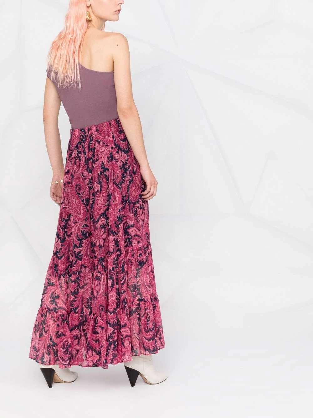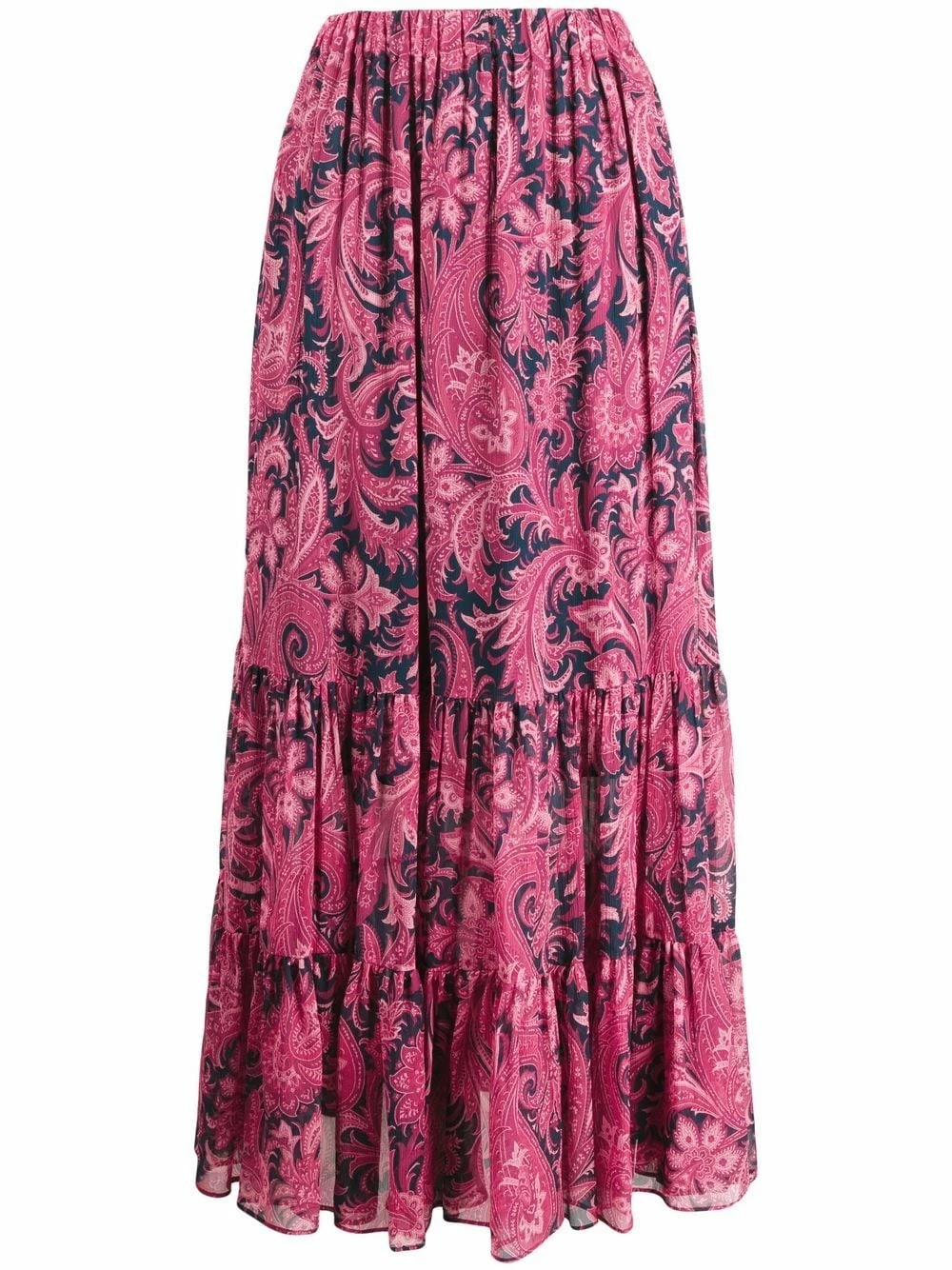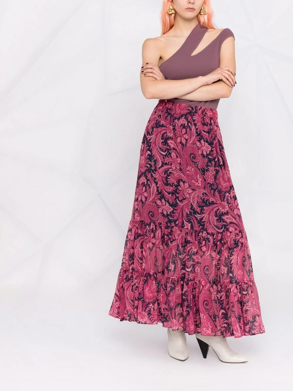Motif cachemire, détails de fronces, taille haute, coupe longue. Couleur : rouge. Matière : soie.