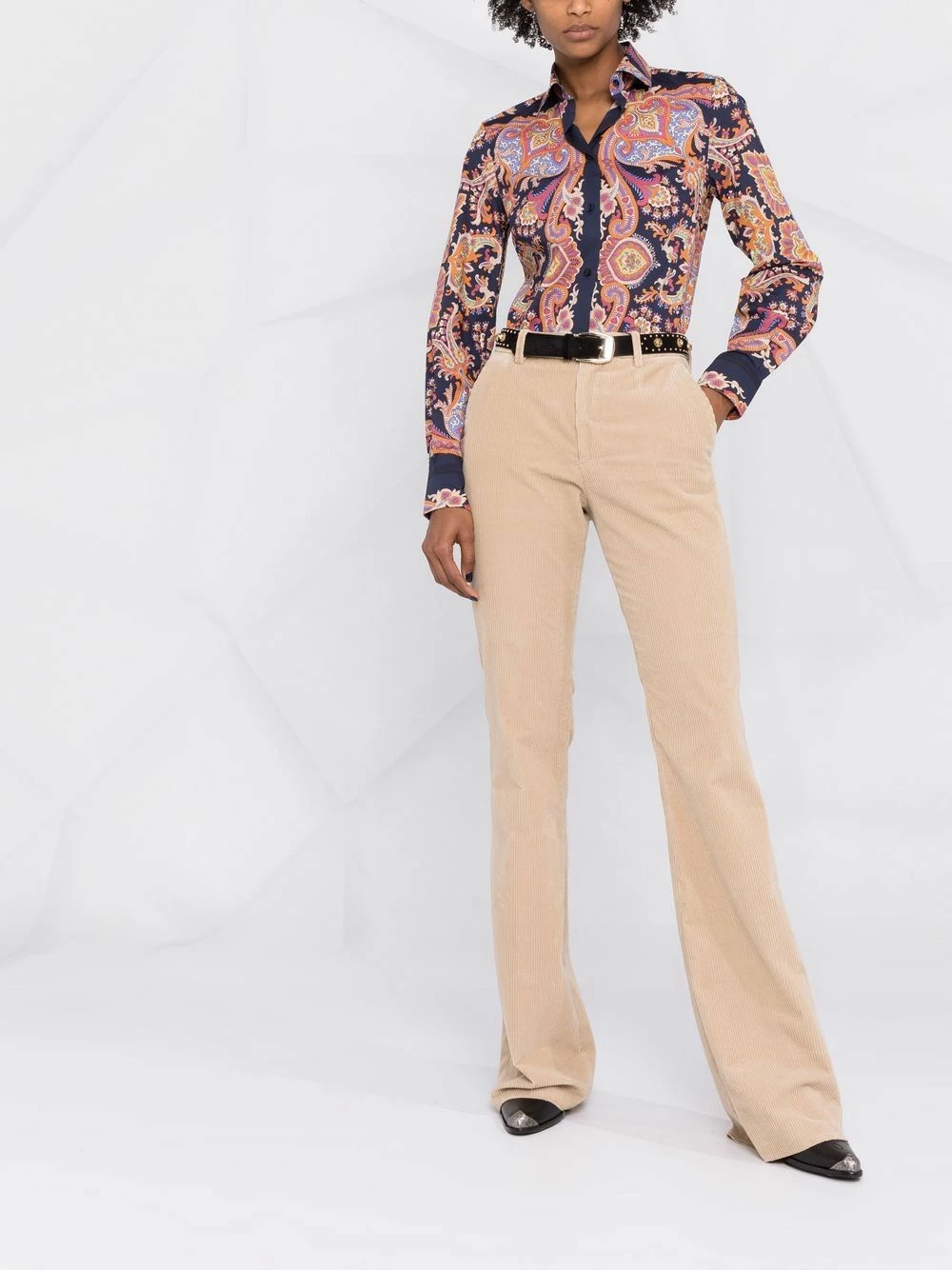 Motif cachemire, col classique, manches longues, poignets boutonnés, ourlet incurvé.