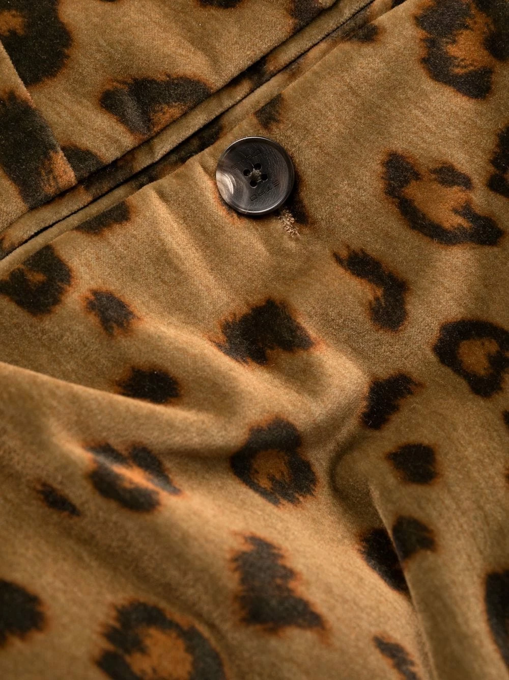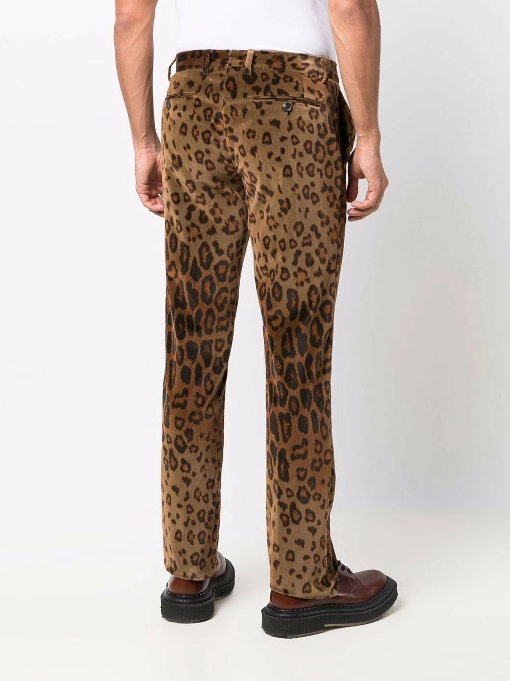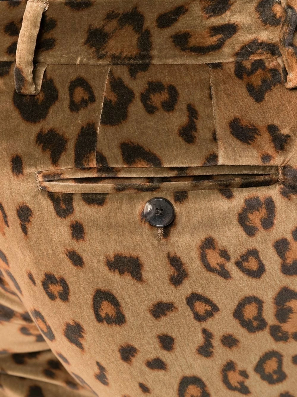 Effet velours, imprimé léopard, taille mi-haute, fermeture boutonnée, passants de ceinture, deux poches latérales fendues, poches arrière passepoilées, coupe droite.