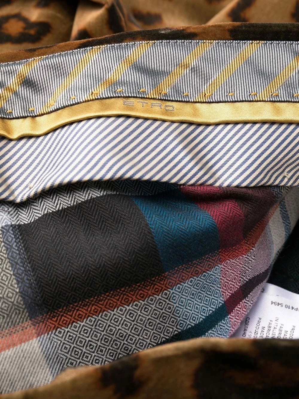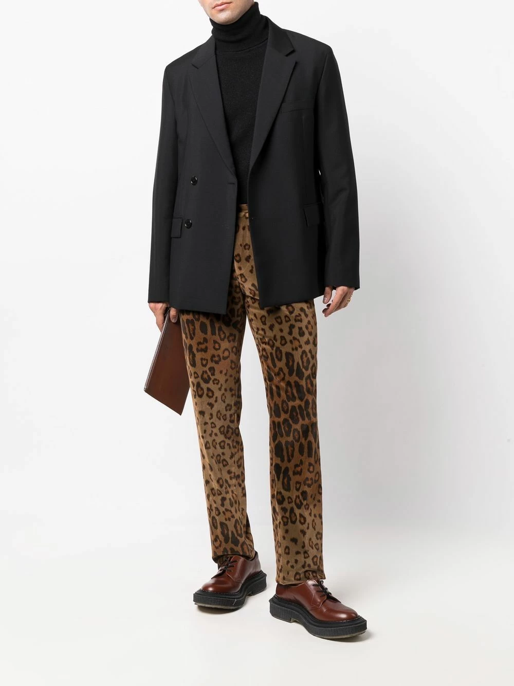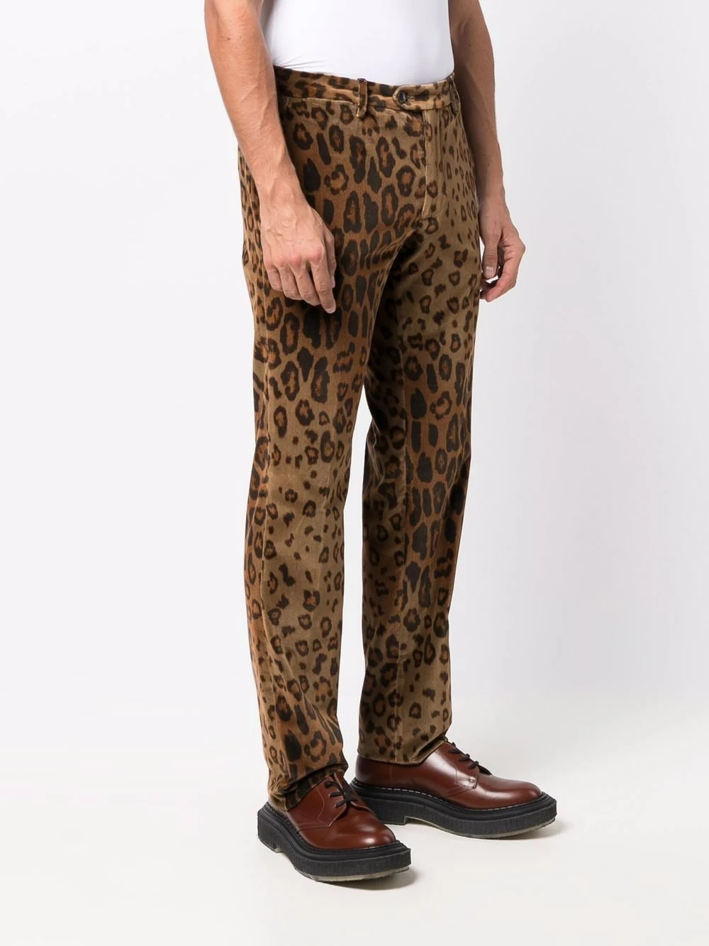 Effet velours, imprimé léopard, taille mi-haute, fermeture boutonnée, passants de ceinture, deux poches latérales fendues, poches arrière passepoilées, coupe droite.