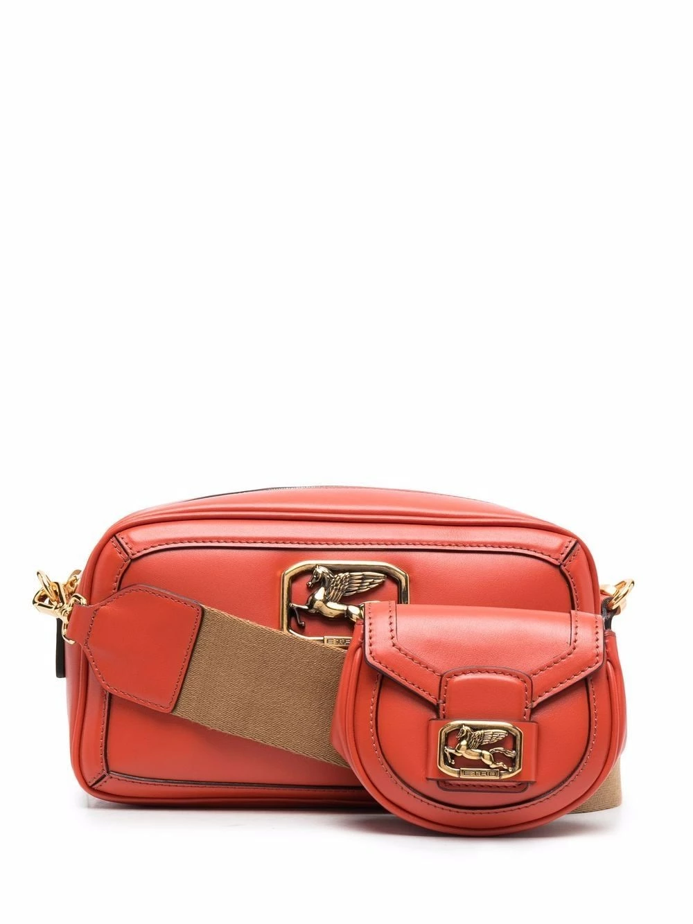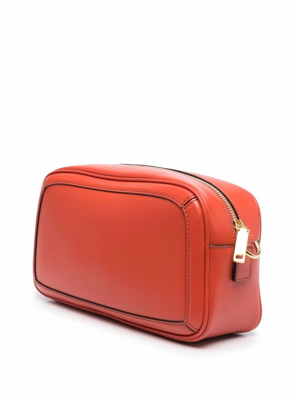 Finitions en métal doré, plaque logo dorée, fermeture zippée sur le dessus, bride porté épaule détachable et ajustable, pochette détachable, compartiment principal, patch logo intérieur. Couleur : orange. Matière : cuir de veau.