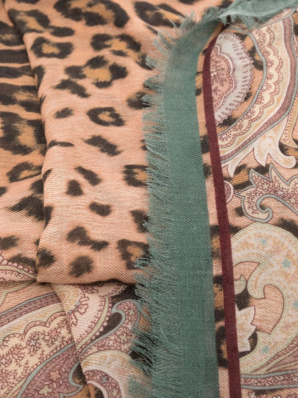 Imprimé léopard, motif cachemire, bords frangés. Couleur : marron. Matière : cachemire.