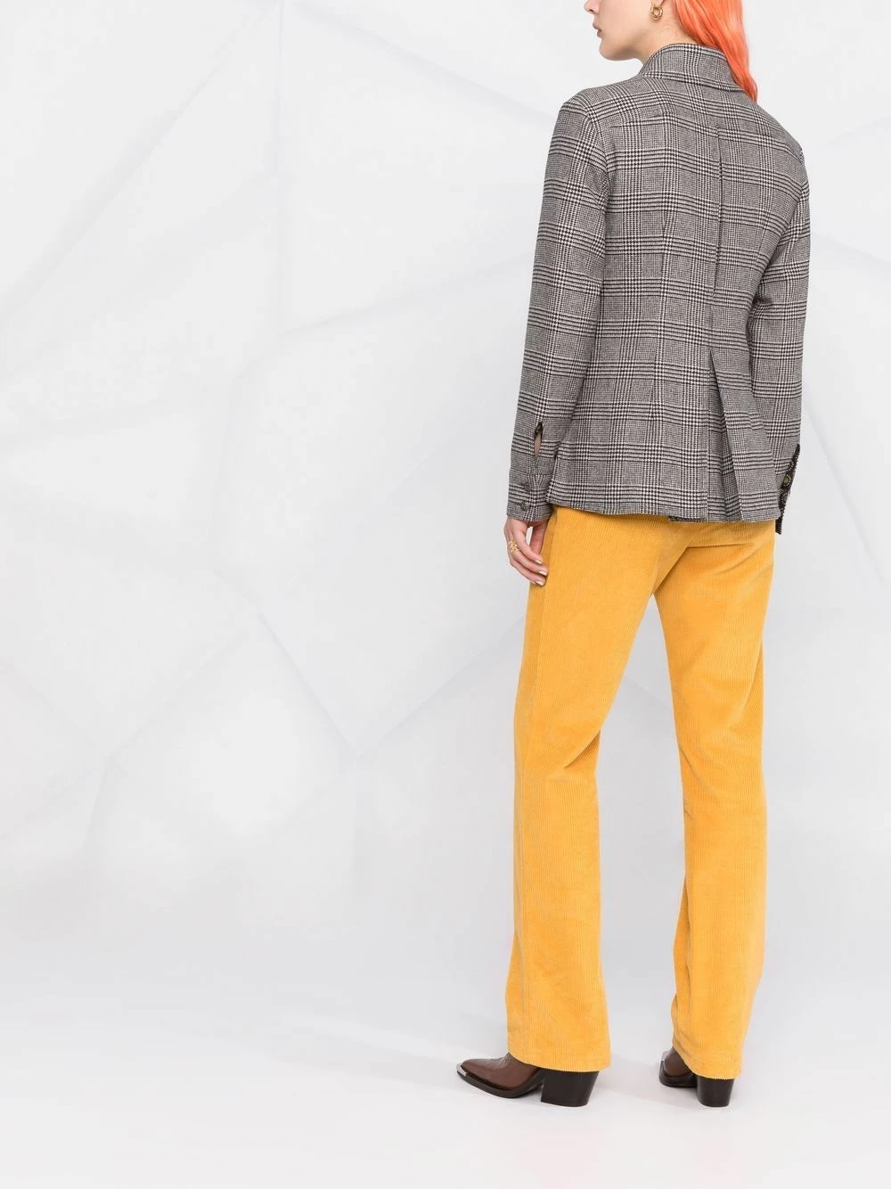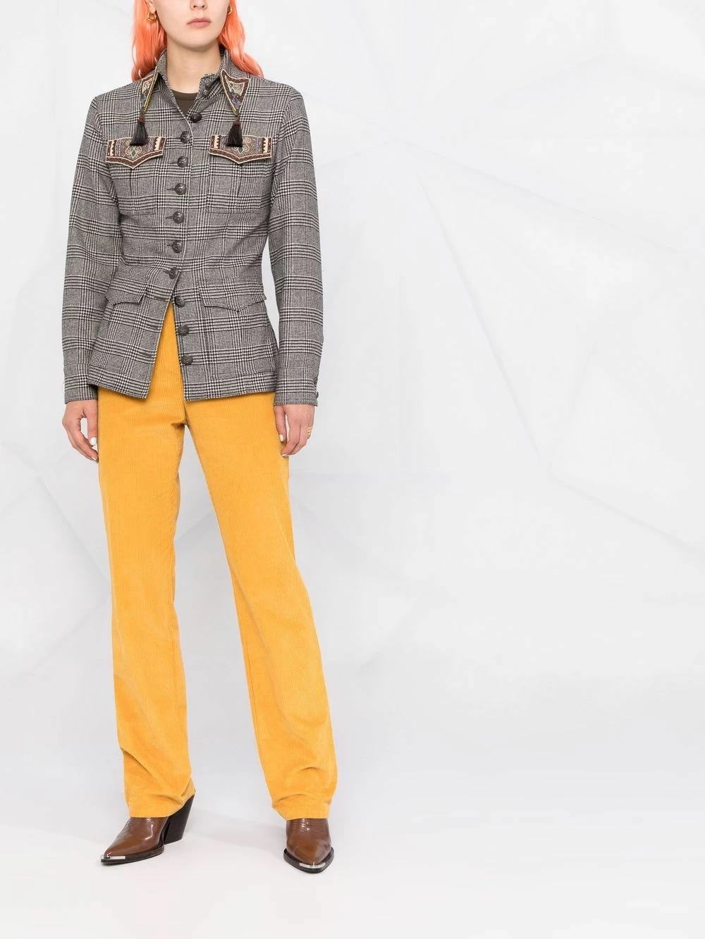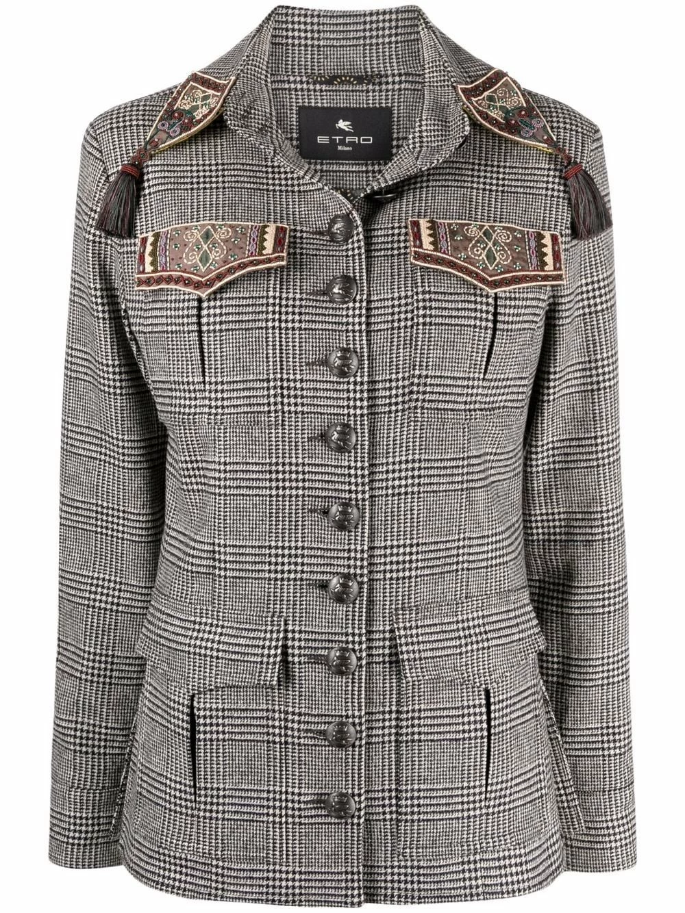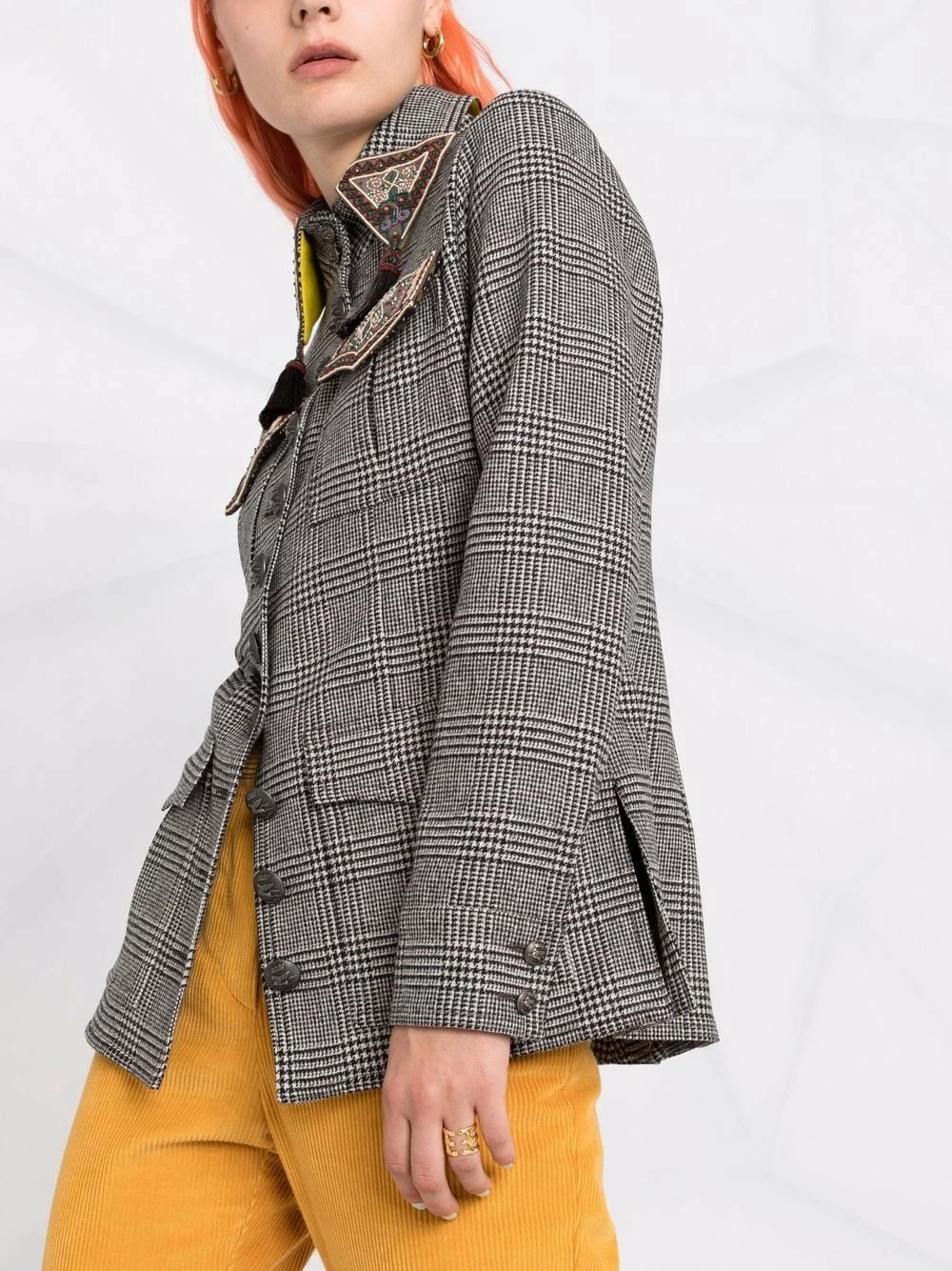 Imprimé à carreaux, broderies, boutonnière sur le devant, manches longues, poches devant à rabat, fente arrière. Couleur : gris.
