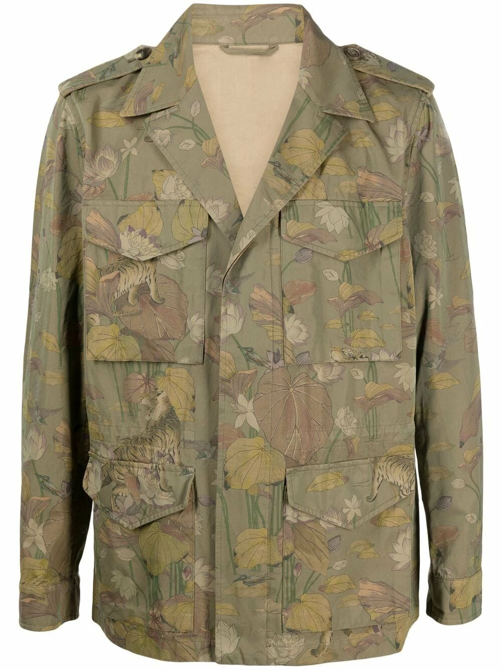 Motif de fleurs, revers pointus, fermeture dissimulée sur le devant, manches longues, deux poches poitrine à rabat, deux poches à rabat sur le devant, sans doublure.