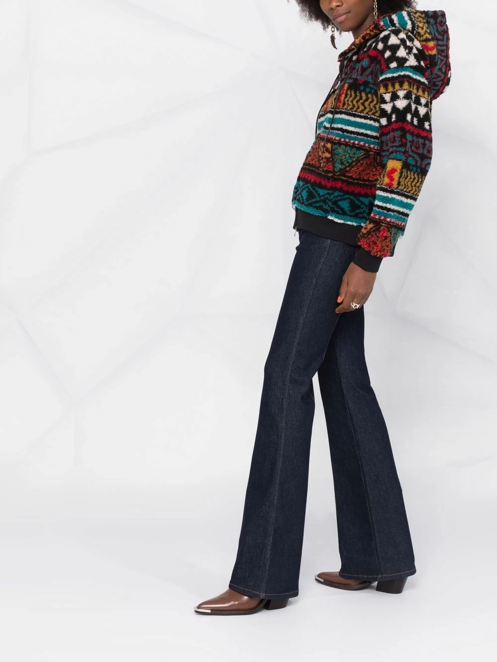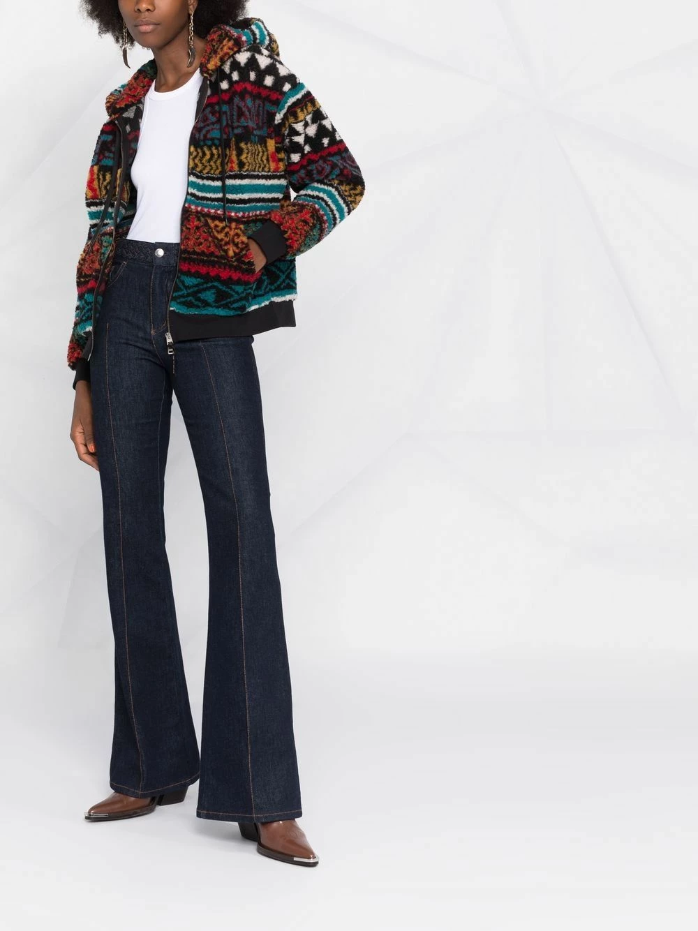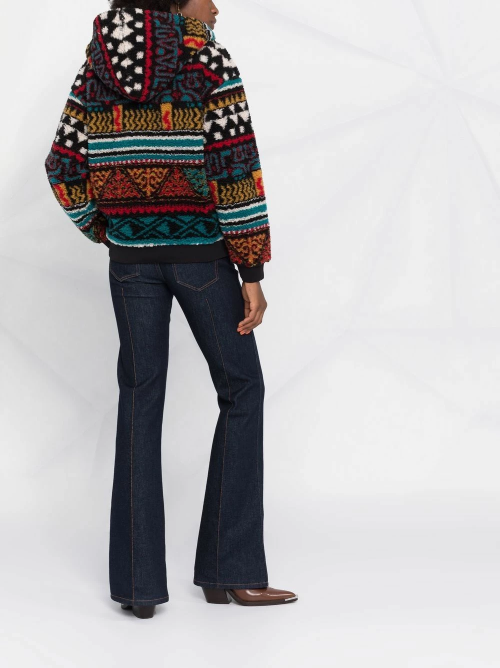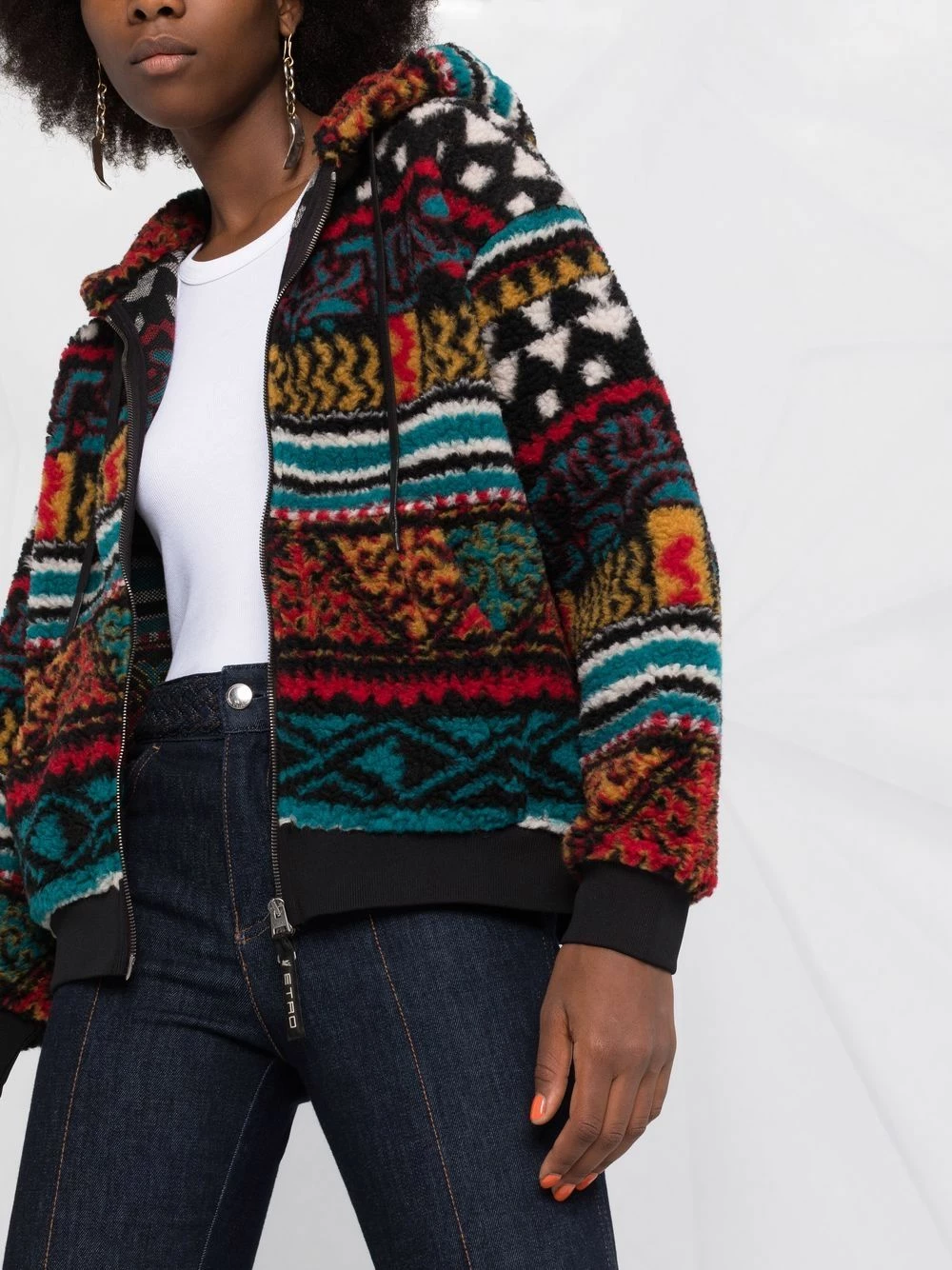 Design tricoté, texture polaire, jacquard à motifs, capuche à lien de resserrage, fermeture zippée à double sens sur le devant, manches longues, détail nervuré.
