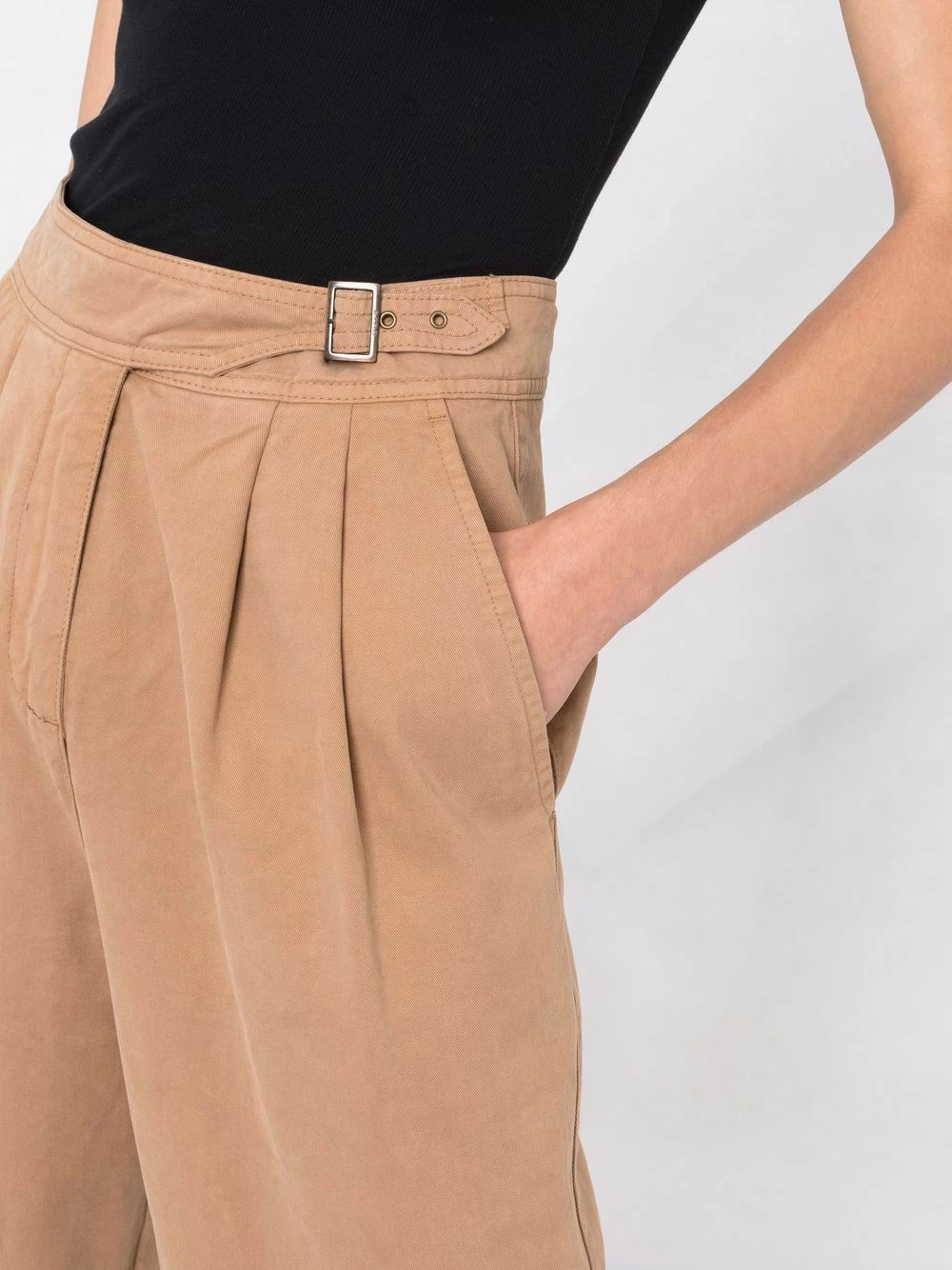 Taille ceinturée, fermeture dissimulée sur le devant, deux poches latérales fendues, coupe fuselée. Matière : coton.
