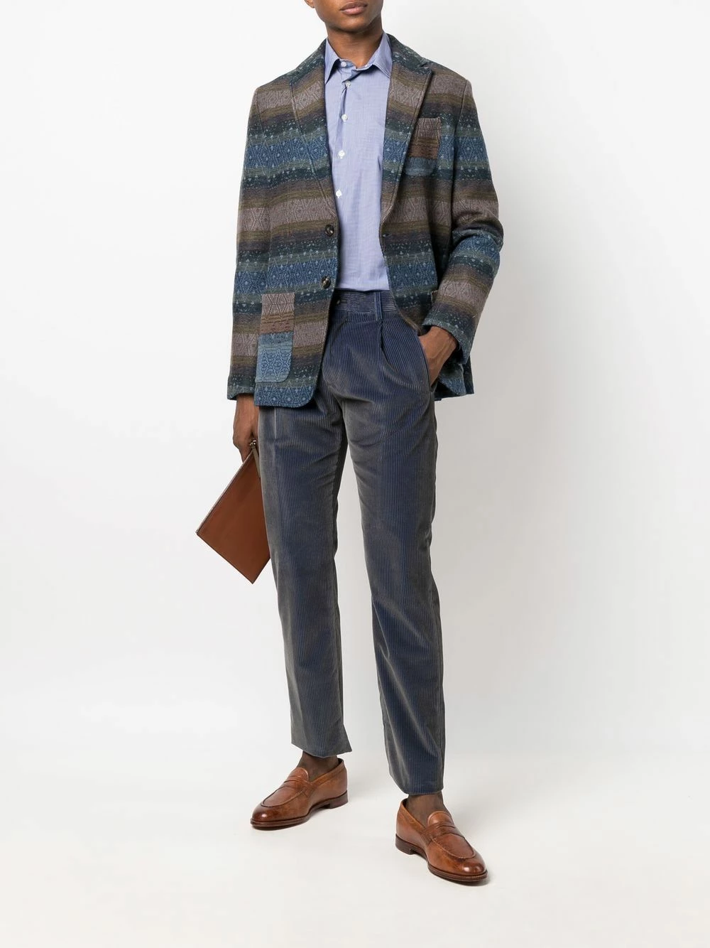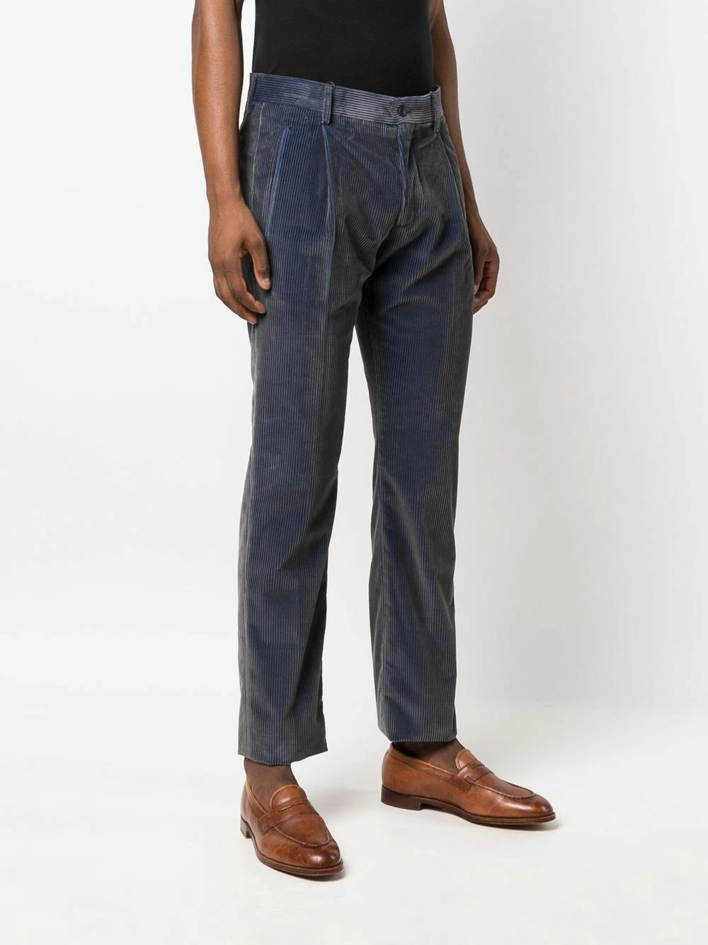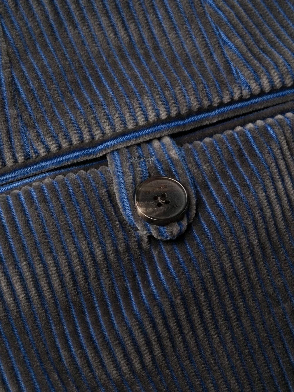 Taille mi-haute, coupe droite, longueur crop, effet velours, détail nervuré, détails de plis, passants de ceinture, fermeture à zip et boutons sur le devant, deux poches passepoilées boutonnées à l’arrière. Couleur : bleu. Matière : coton.