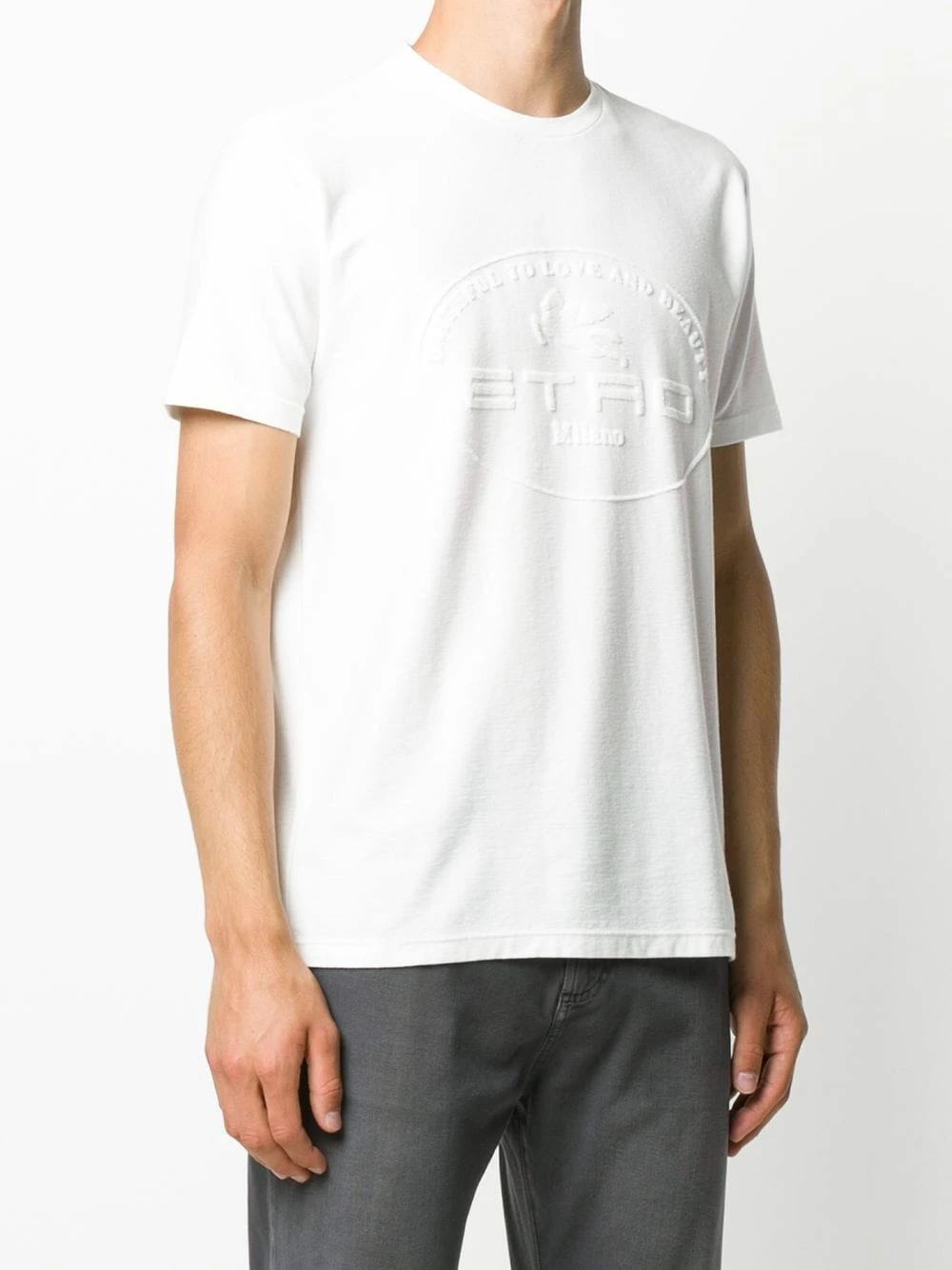 Détail de logo embossé, encolure ronde, manches courtes. Couleur : blanc. Matière : coton mélangé.