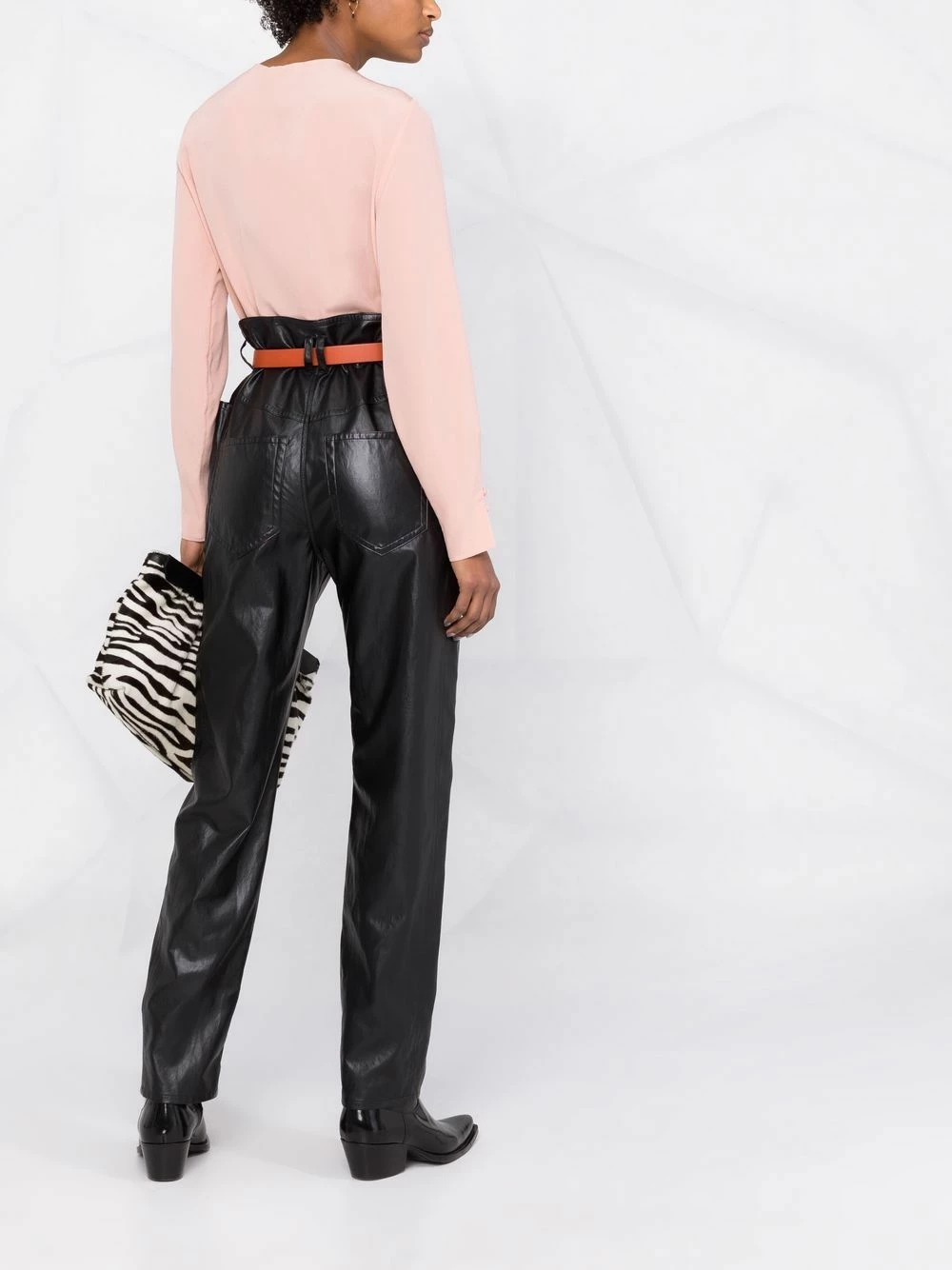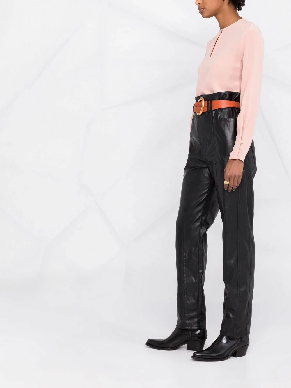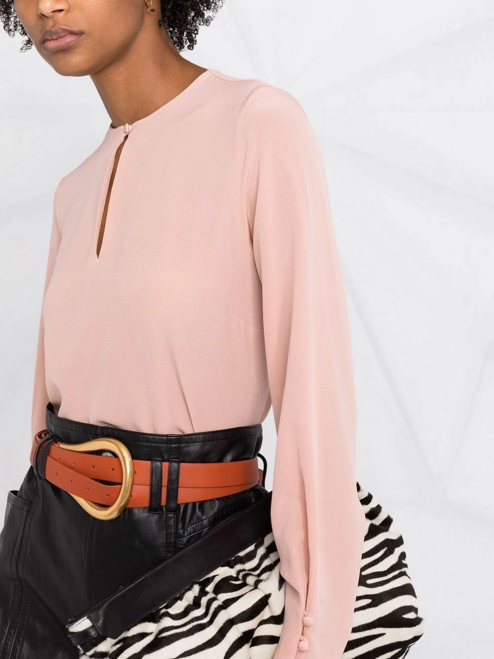 Col à ouverture goutte d’eau, boutonnière sur le devant, manches longues, poignets boutonnés, fentes latérales. Matière : soie.