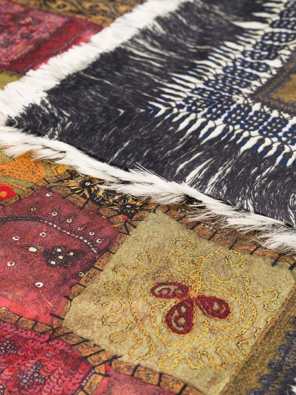 Imprimé patchwork, détails de franges. Couleur : multicolore. Matière : soie.