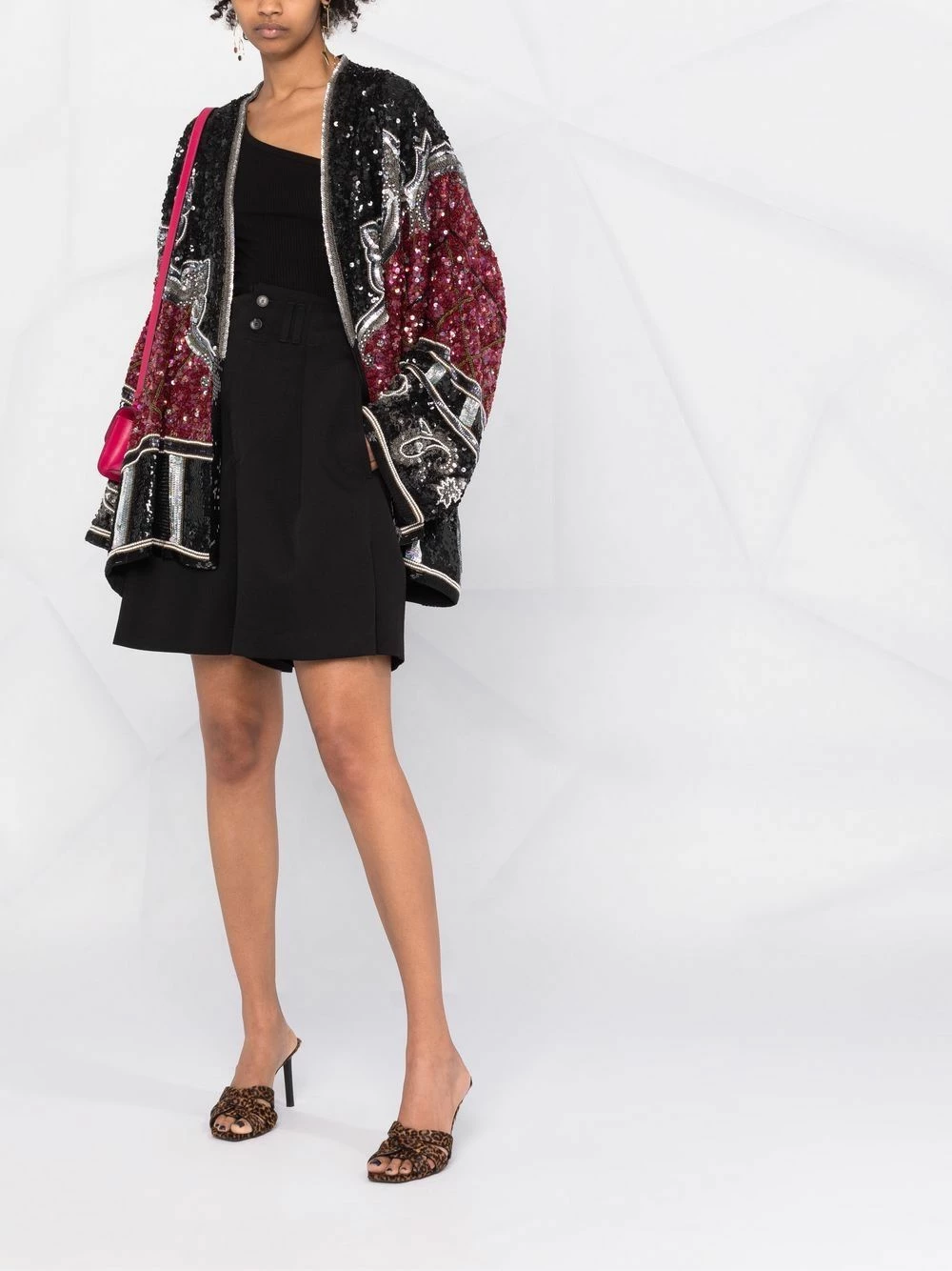 Taille haute, boutonnière sur le devant, coupe classique, passants de ceinture, poches latérales fendues. Couleur : noir. Matière : laine.
