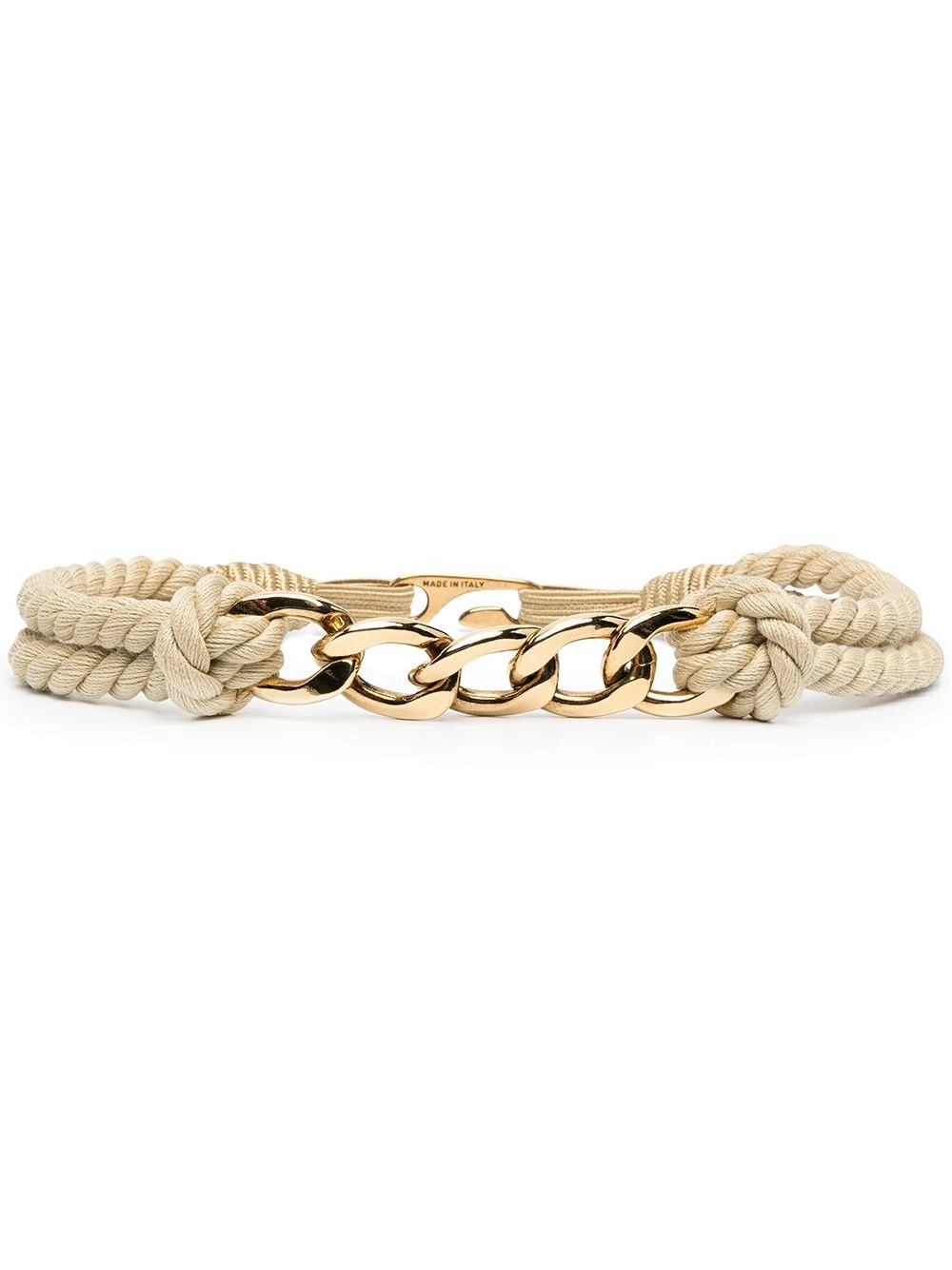 Détails de chaînes, détail de corde, fermeture clip, logo gravé, taille ajustable. Matière : coton.