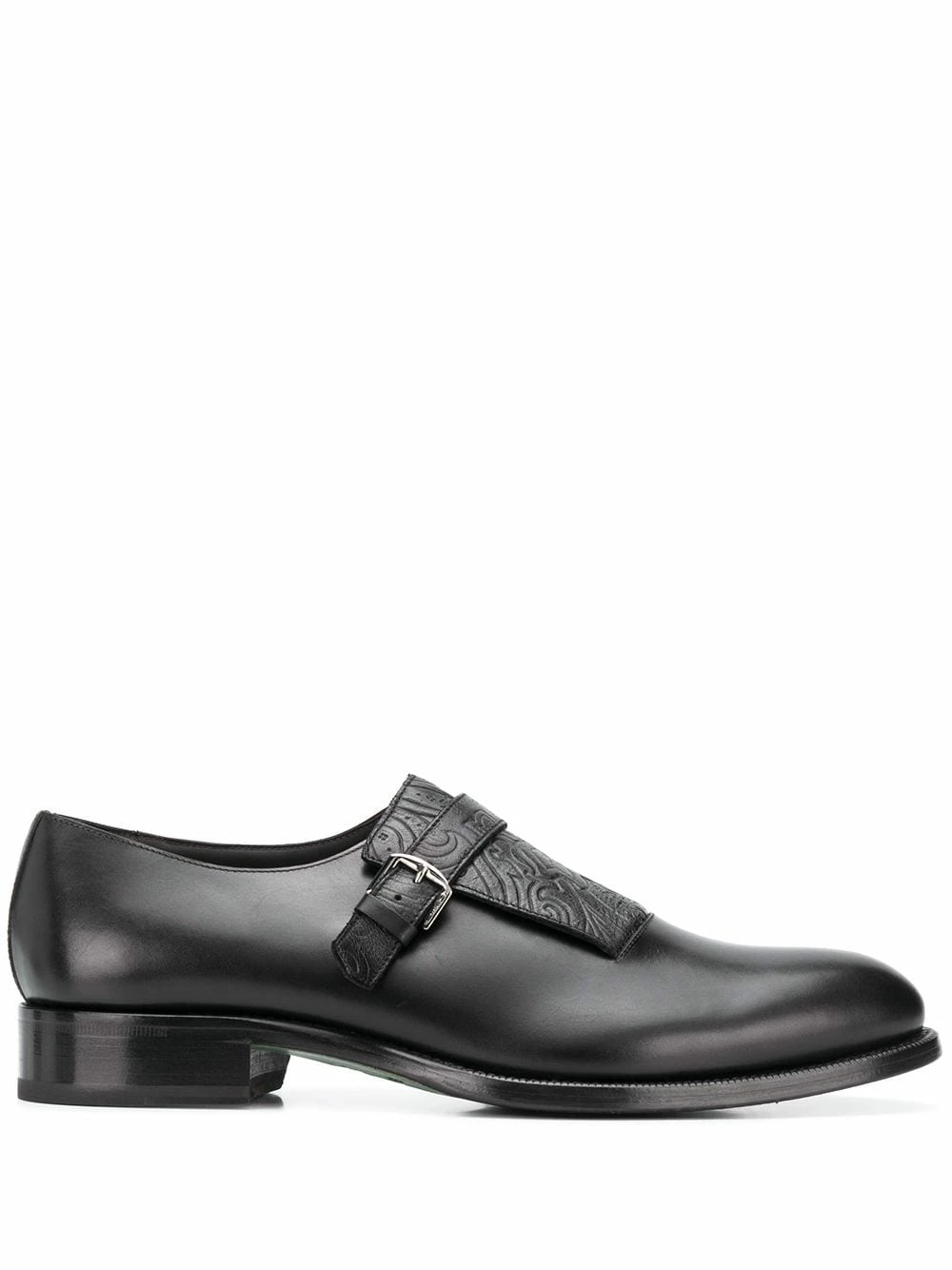Chaussures embossées à boucles en cuir Etro avec bout rond, semelle intérieure à logo, fermeture à boucle et talon bottier. Couleur : noir.