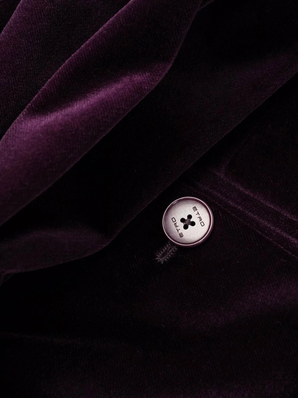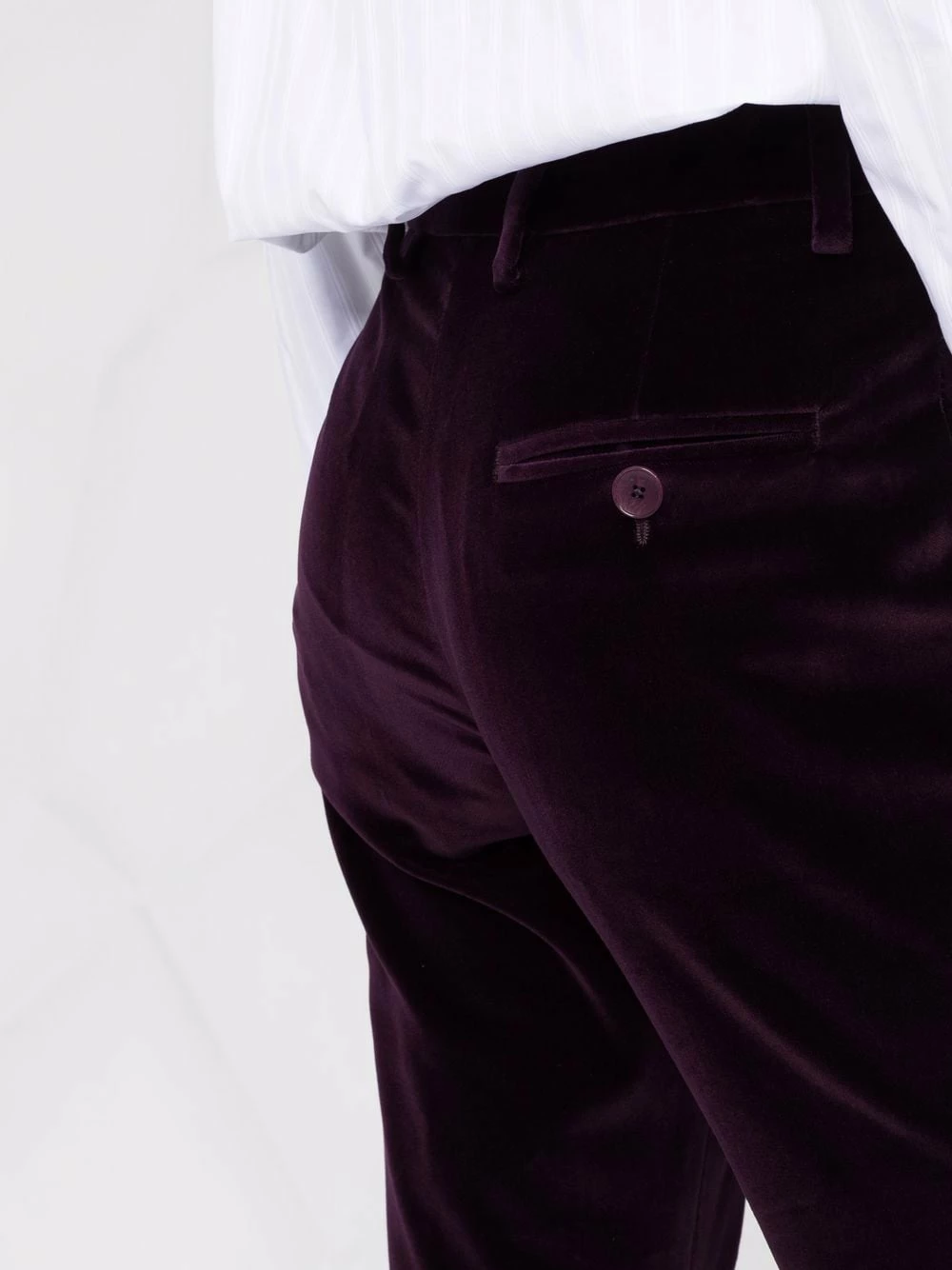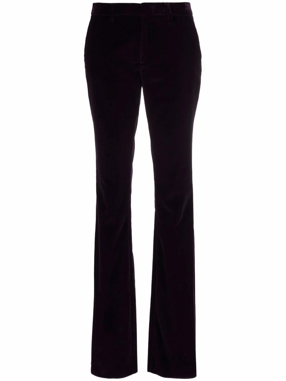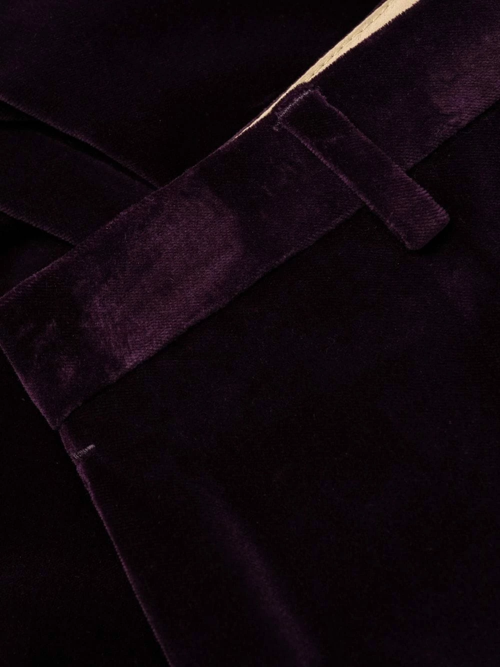 Effet velours, passants de ceinture, fermeture dissimulée sur le devant, deux poches latérales fendues, poche arrière boutonnée, coupe évasée. Couleur : violet.