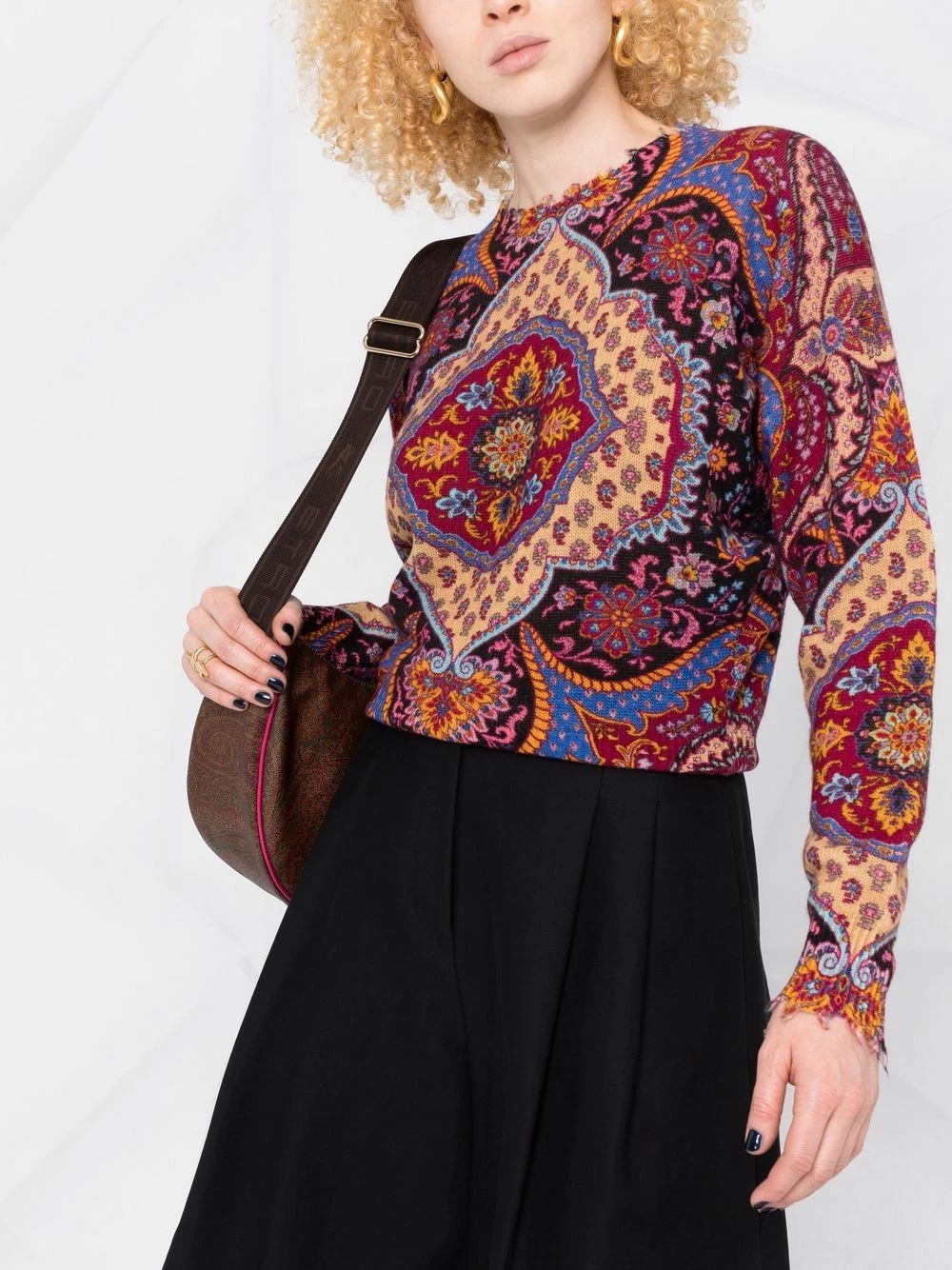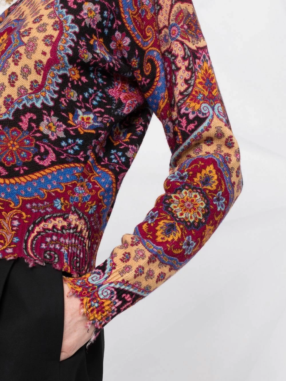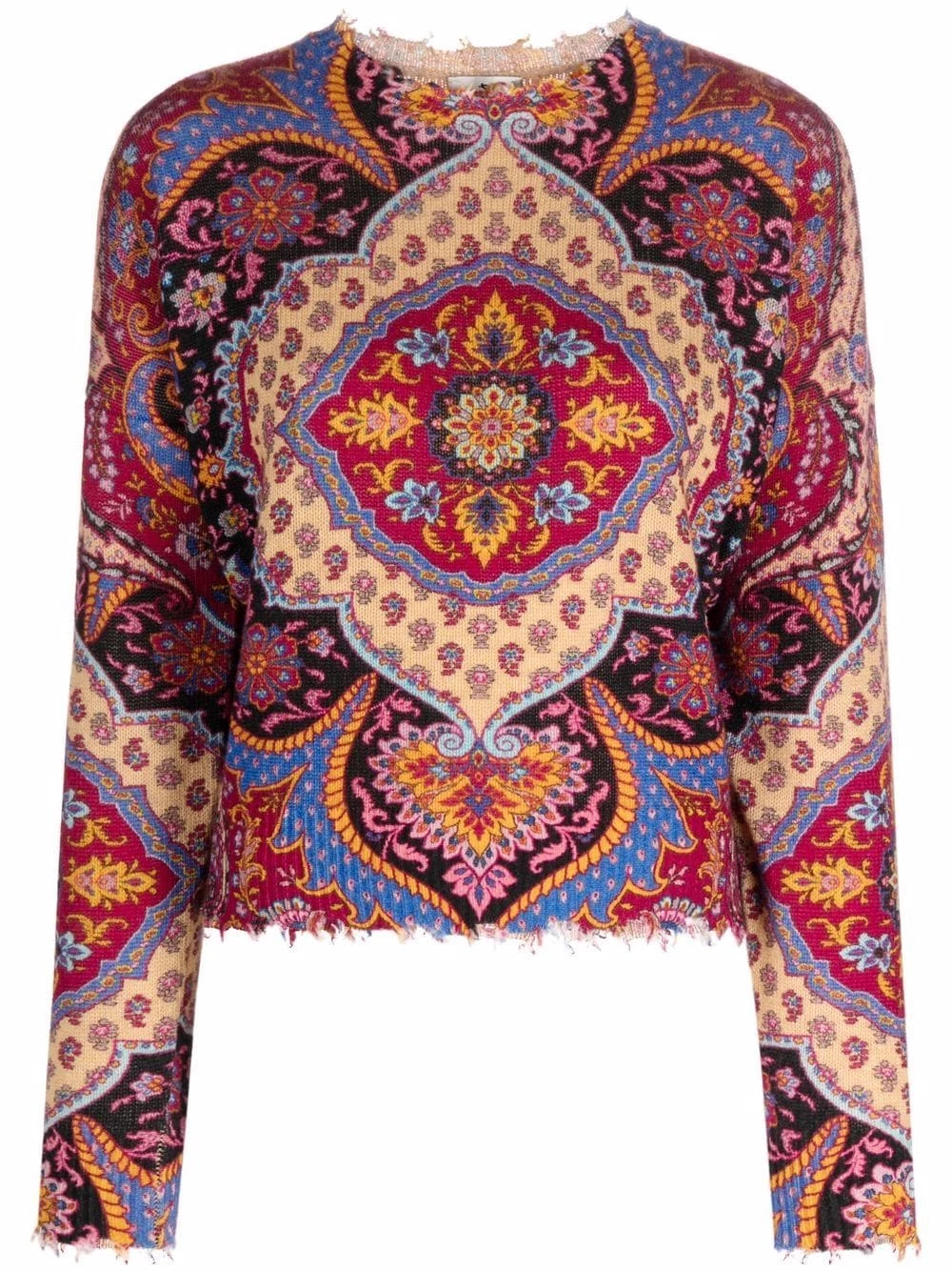 Maille fine, motif cachemire, encolure ronde, manches longues, ourlet droit, bords frangés. Matière : laine.