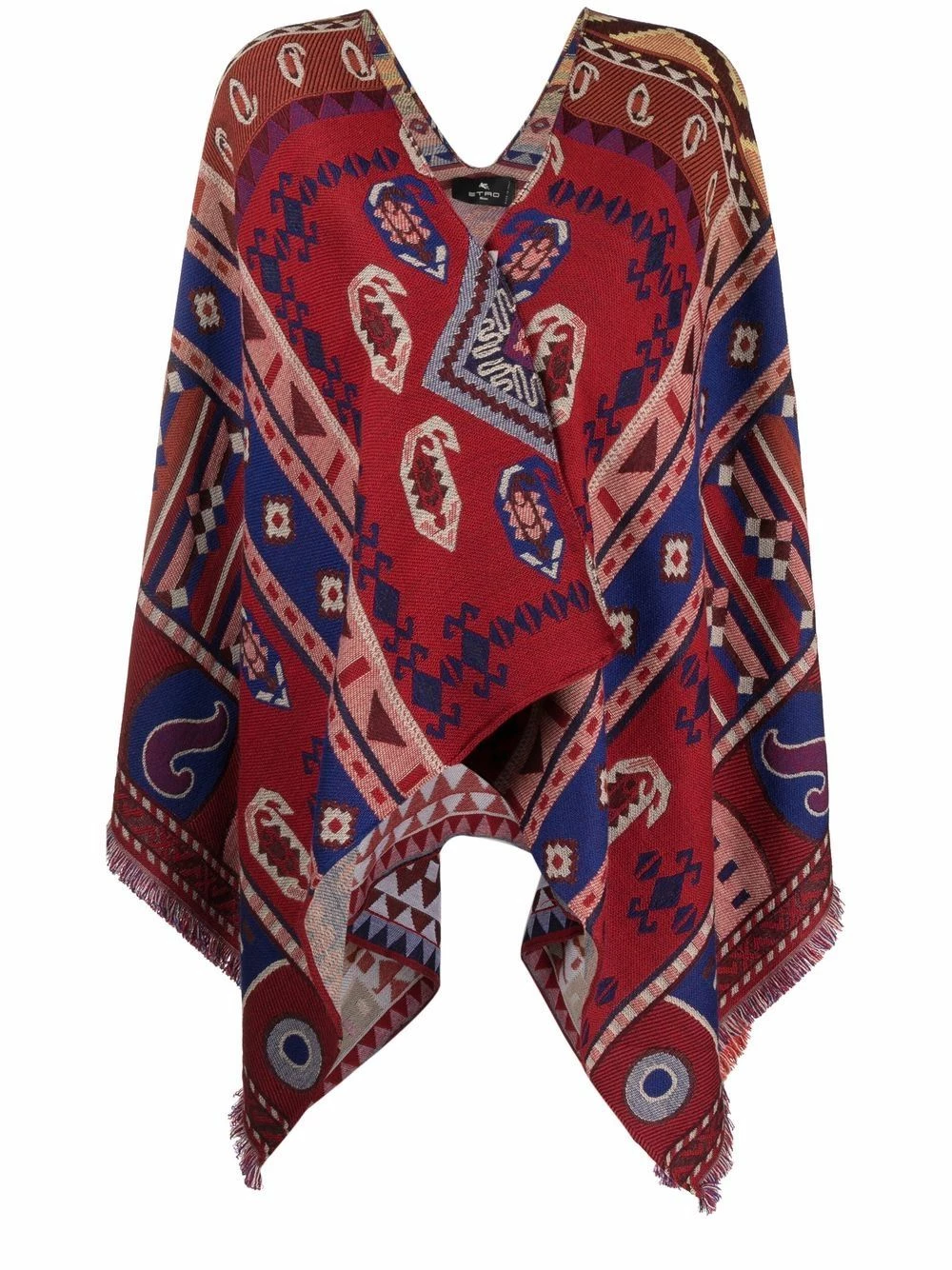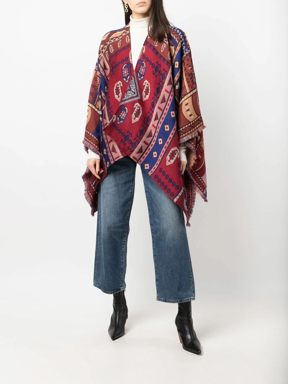 Motif cachemire, devant ouvert, manches longues, bordure à franges, ourlet asymétrique.