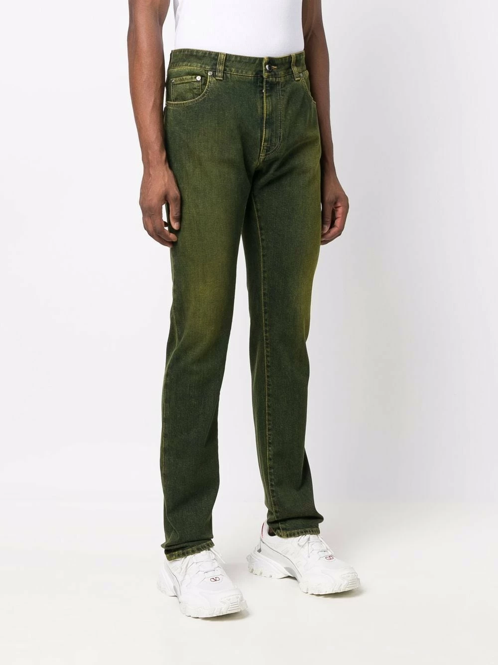 Logo brodé à l’arrière, effet délavé, taille mi-haute, fermeture boutonnée, passants de ceinture, cinq poches classiques, coupe droite.