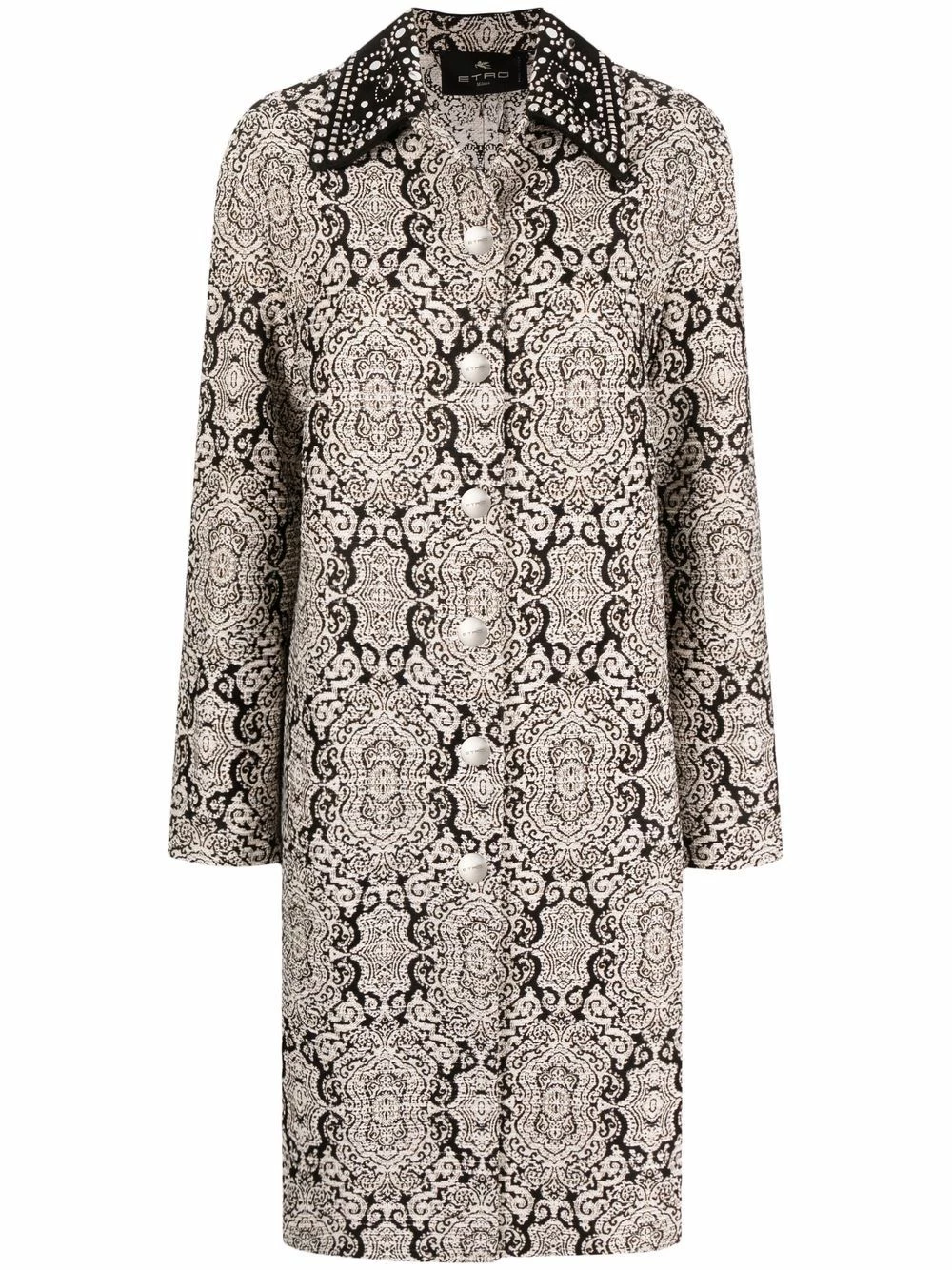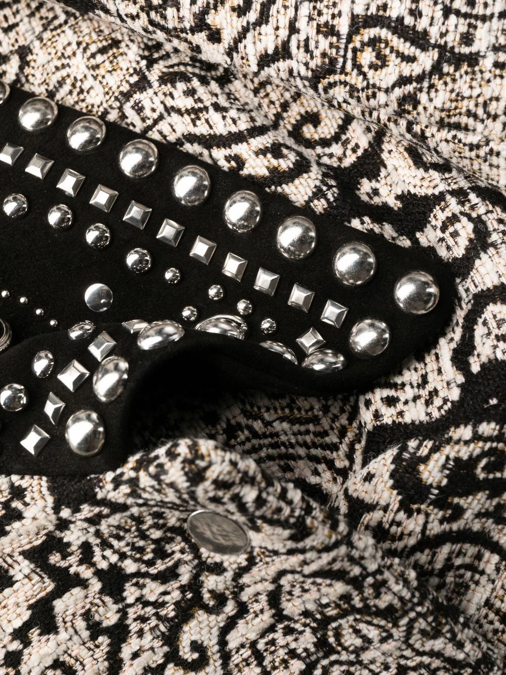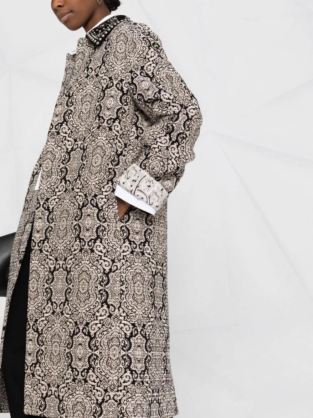 Jacquard à motifs, col classique, détails de clous, finitions en métal argenté, manches longues, boutonnière sur le devant, deux poches latérales fendues. Matière : laine.