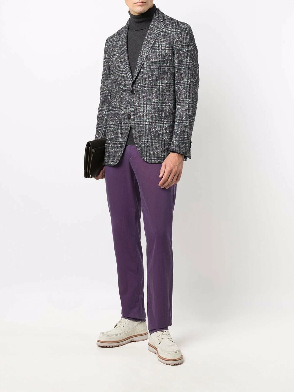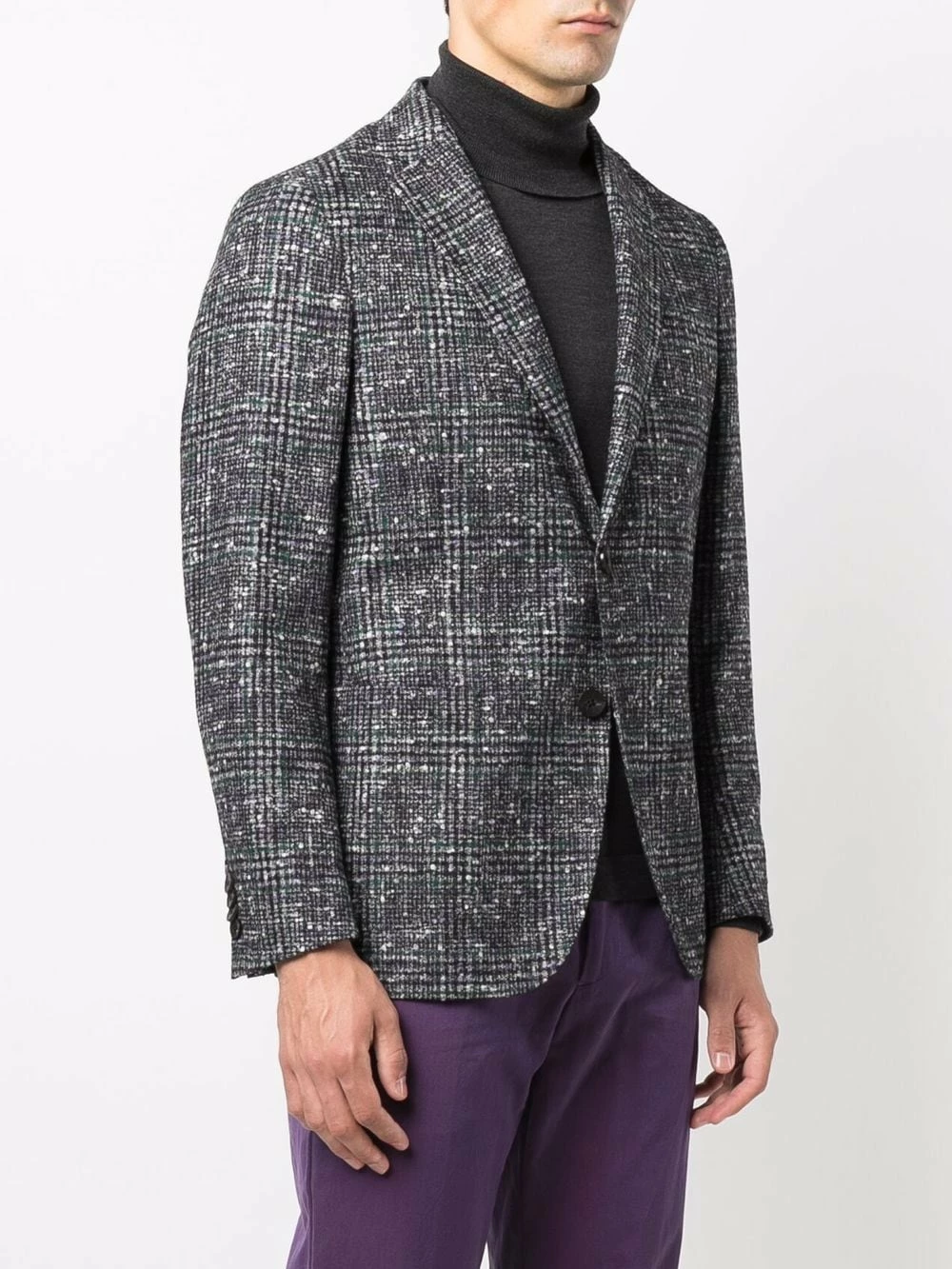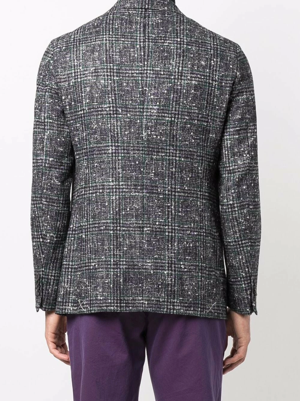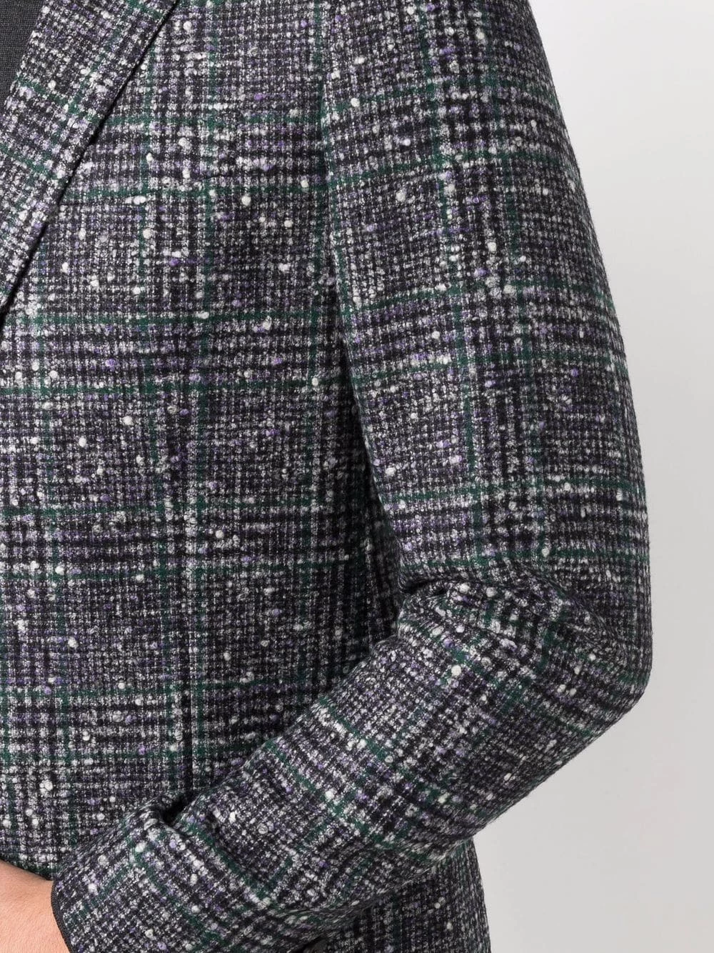 Carreaux Prince de Galles, revers crantés, boutonnière sur le devant, deux poches passepoilées avant, manches longues, poignets boutonnés, ourlet droit.