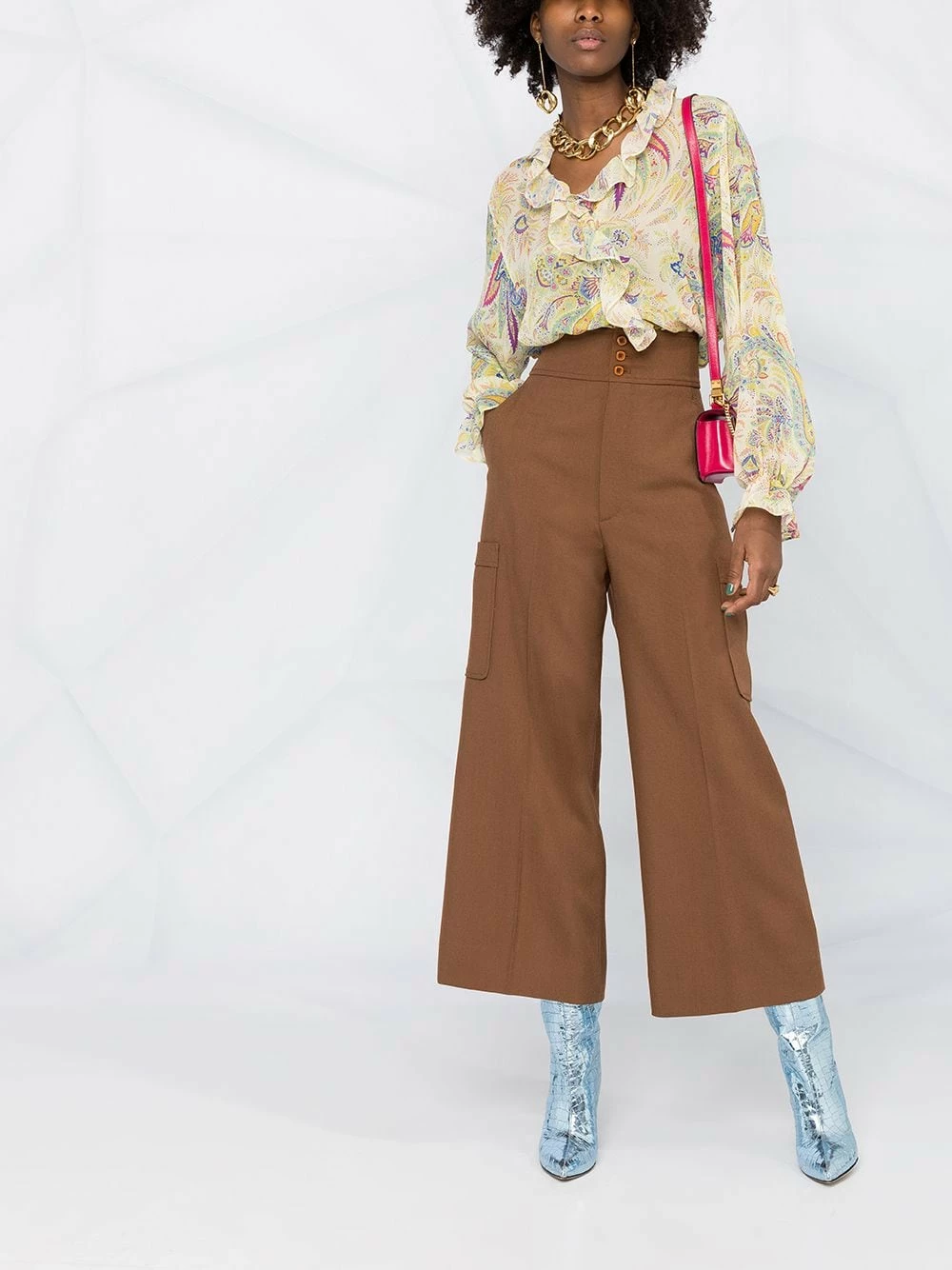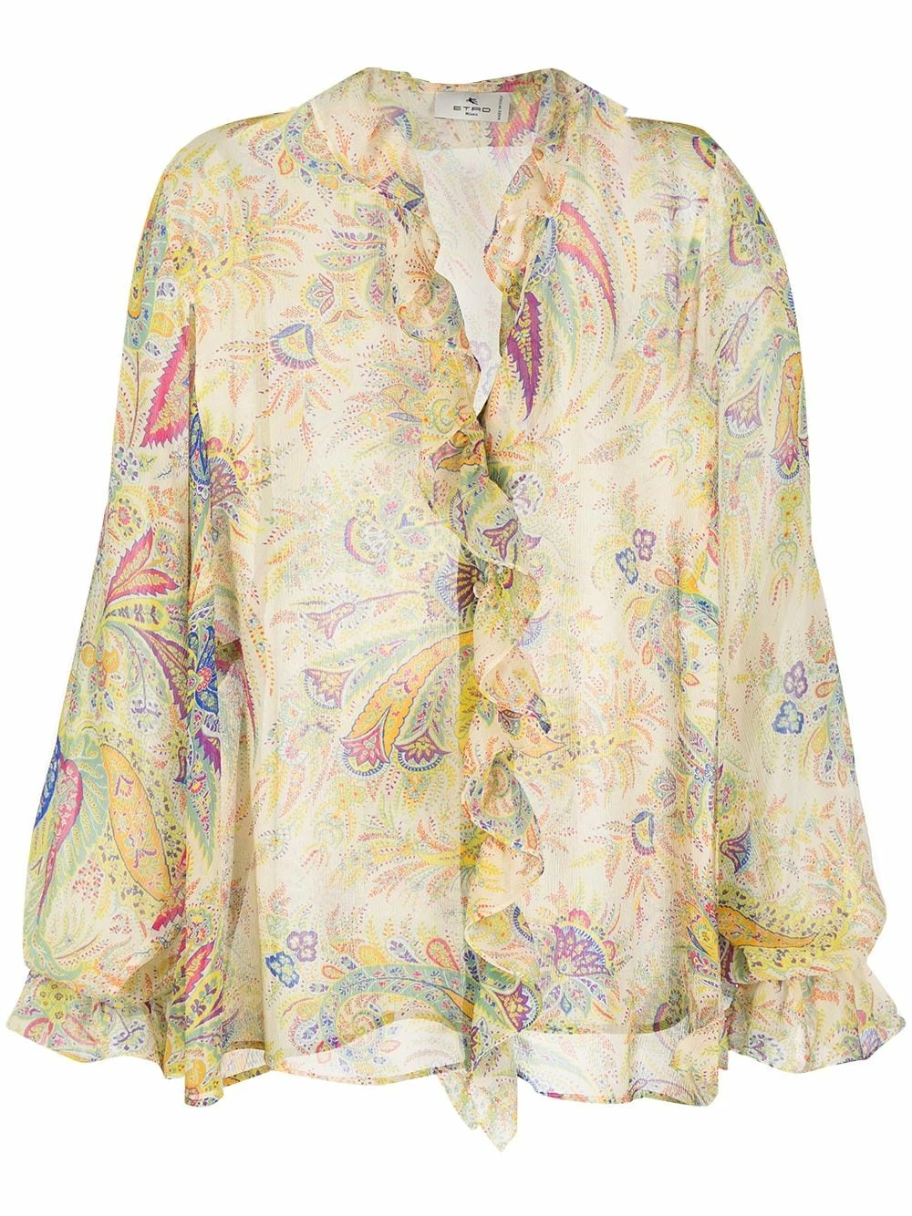 Motif cachemire, détails de volants, manches longues, ourlet droit. Couleur : jaune. Matière : soie.
