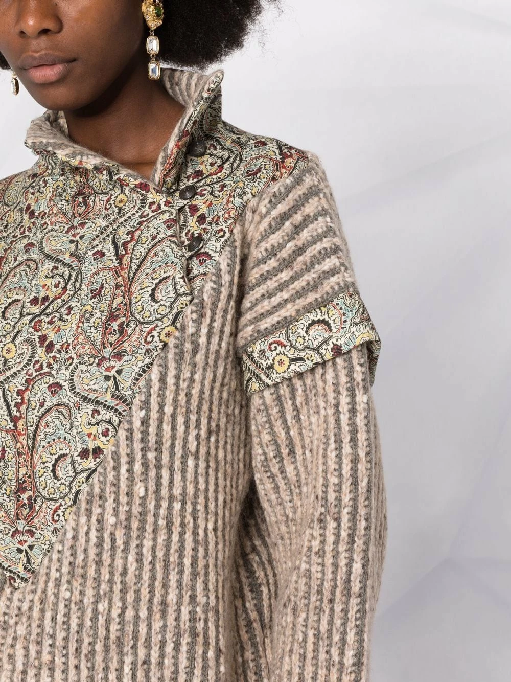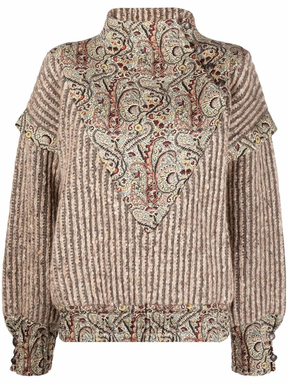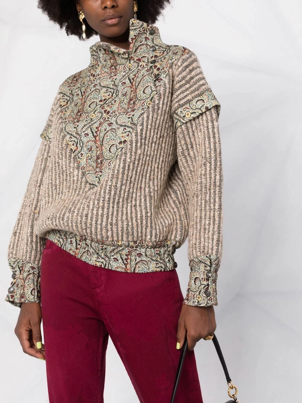 Design à empiècements, motif cachemire, col montant, effet d’épaules descendues, manches longues, poignets boutonnés, ourlet droit.