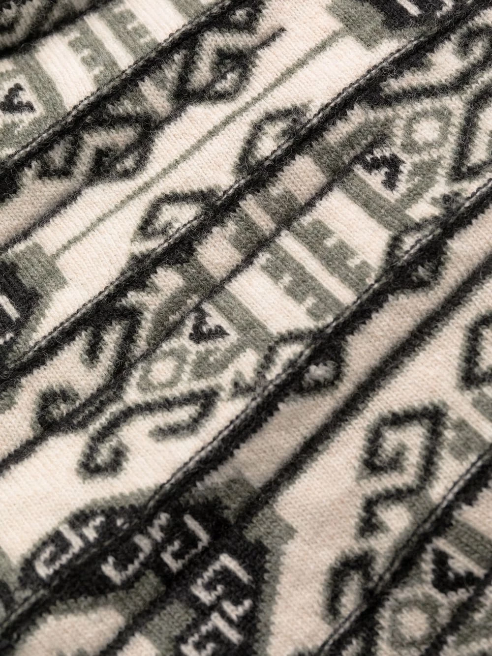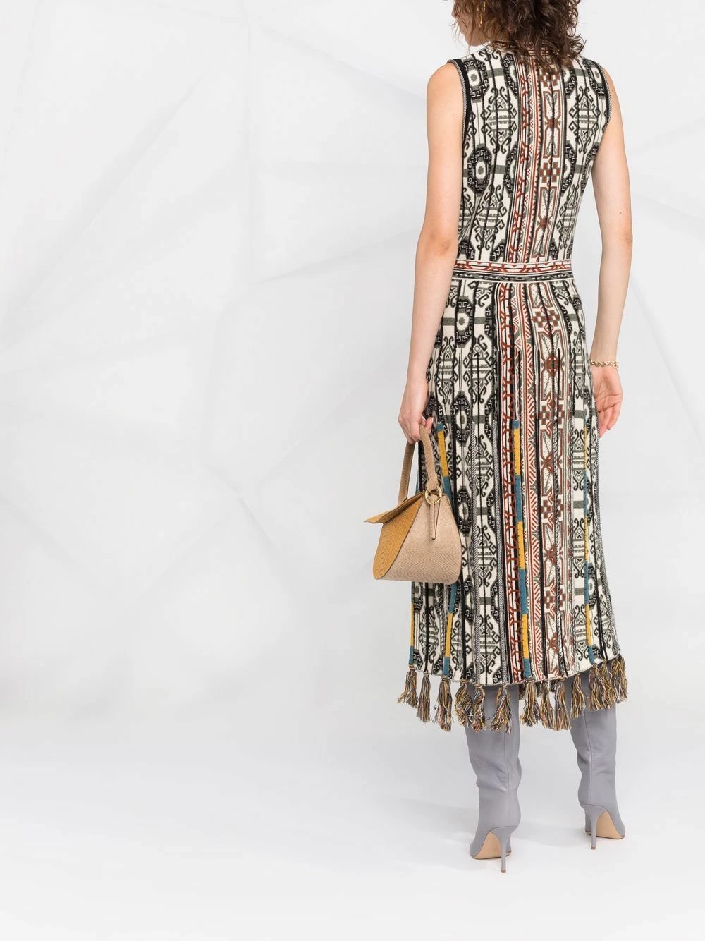 Design tricoté, jacquard à motifs, détail de pompon, encolure ronde, design sans manches, fente latérale.