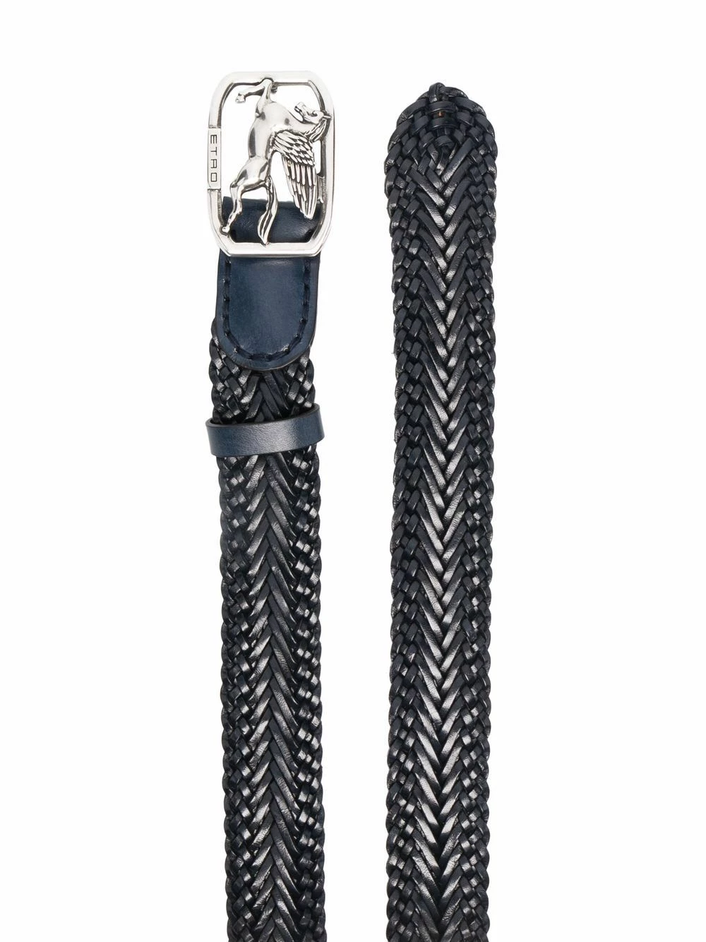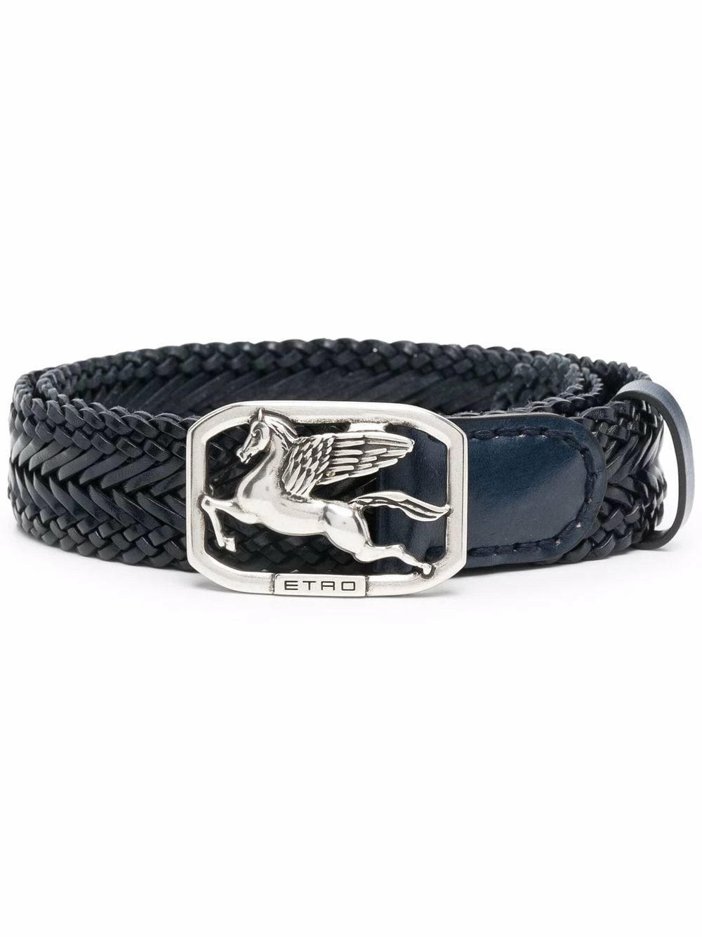 Ornements argentés, lanière tressée, fermeture à boucle logo. Matière : cuir de veau.