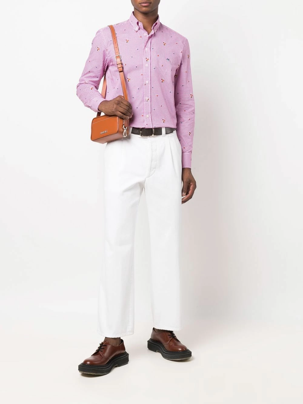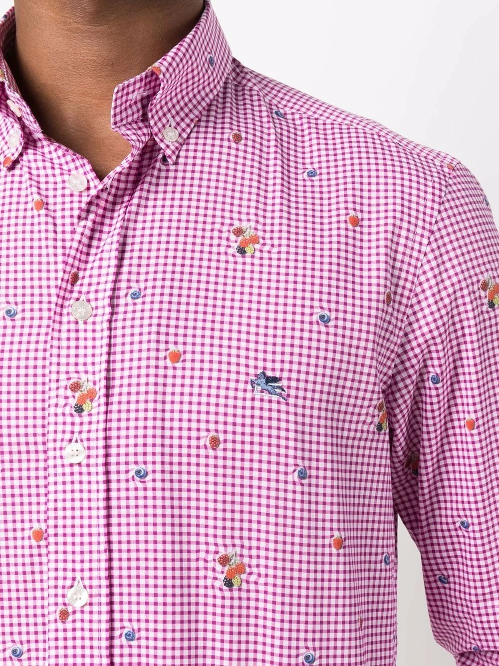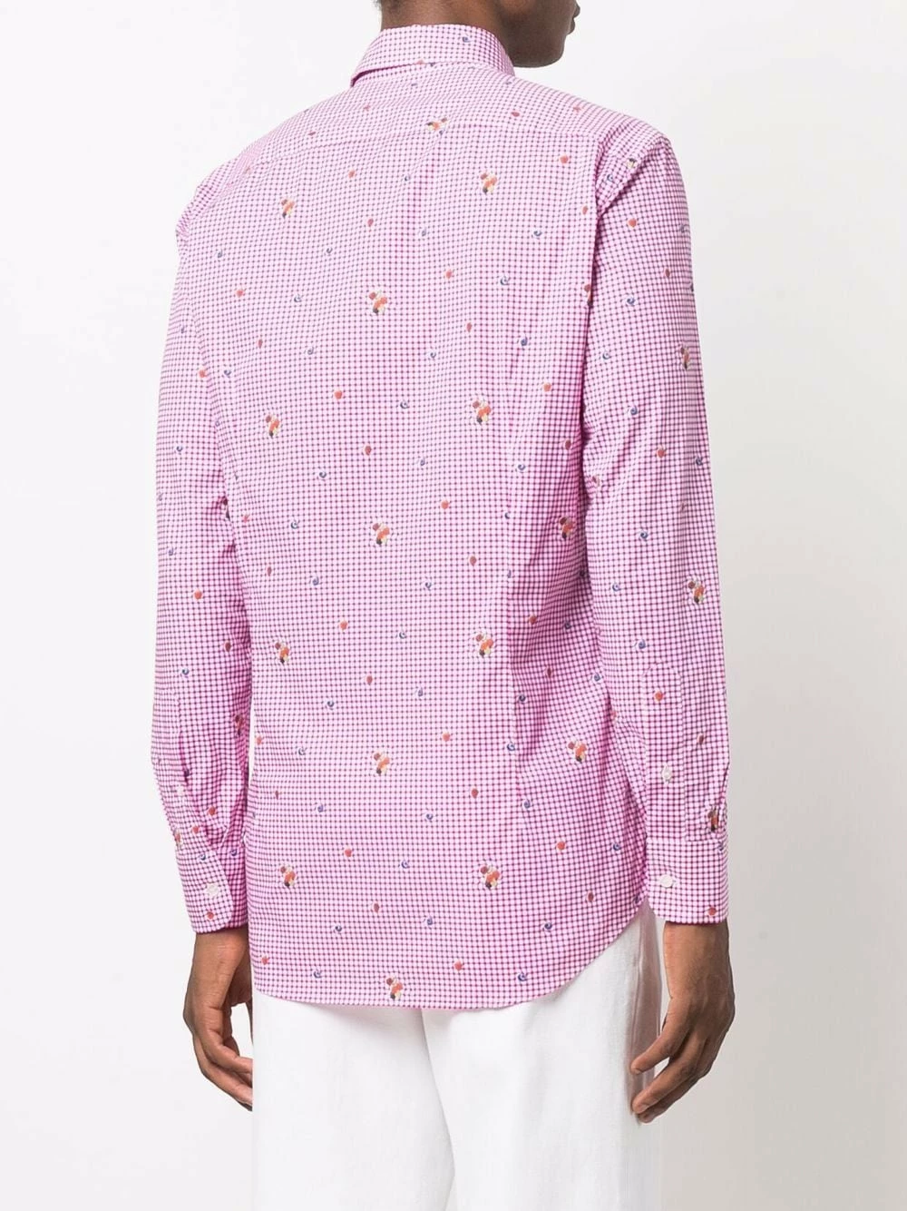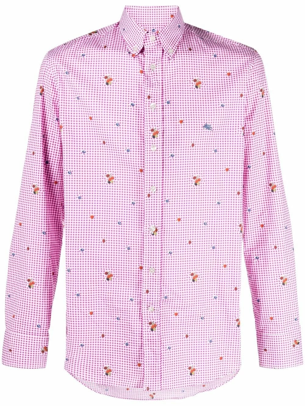 Col boutonné, boutonnière sur le devant, manches longues, ourlet droit, imprimé à carreaux, imprimé fruit. Couleur : rose.
