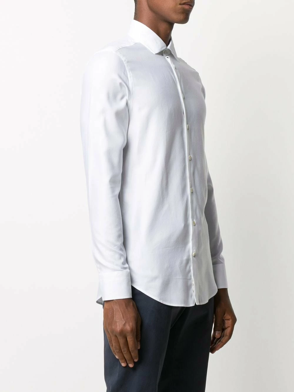 Col italien, manches à poignets boutonnés, ourlet incurvé, boutonnière sur le devant. Couleur : blanc.